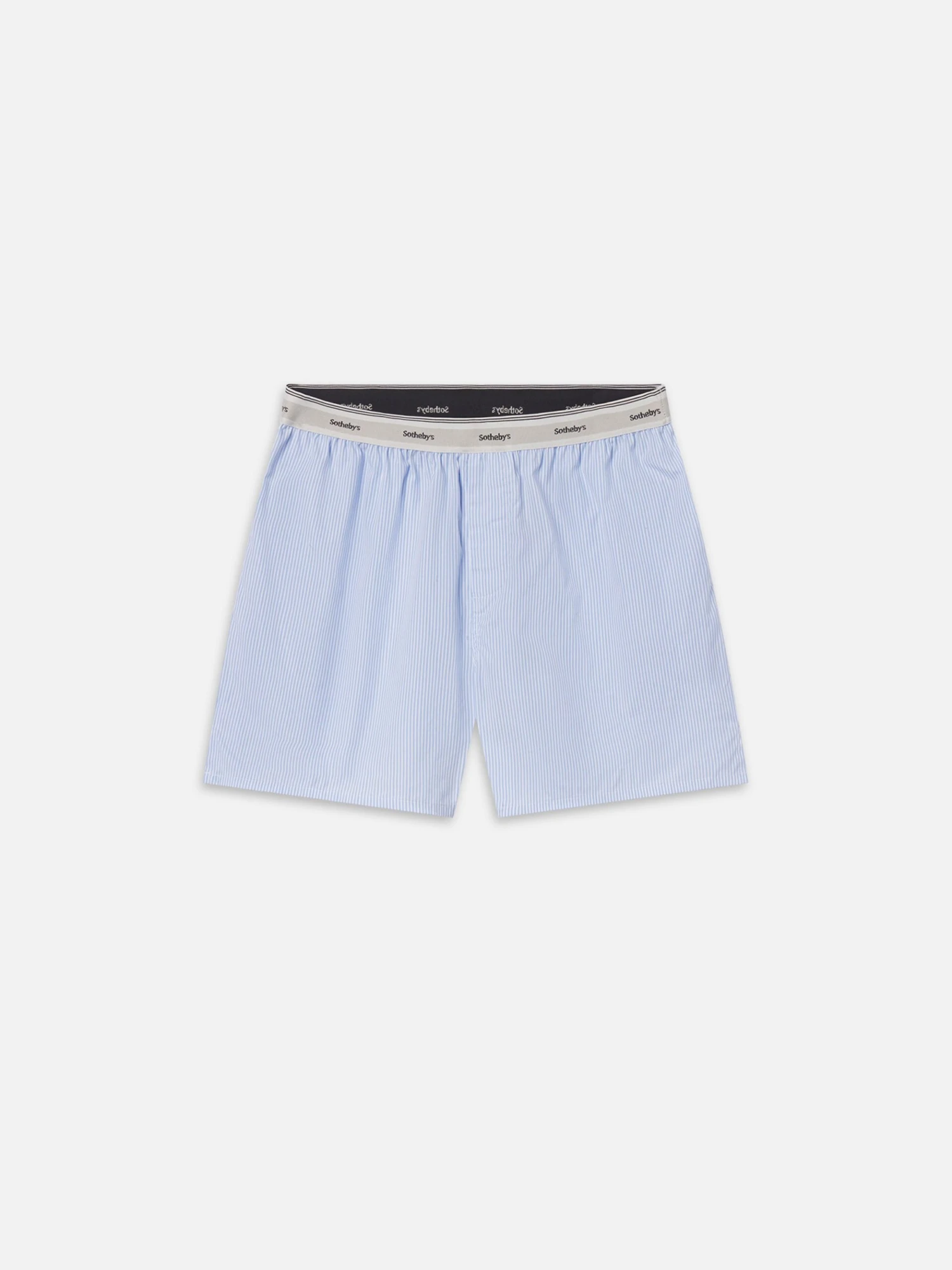 The design features a crisp white backdrop accented by elegant blue vertical stripes, creating a clean and sophisticated aesthetic. A signature Sotheby’s logo label is prominently centered on the elasticated waistband, serving as a mark of heritage style and quality craftsmanship.