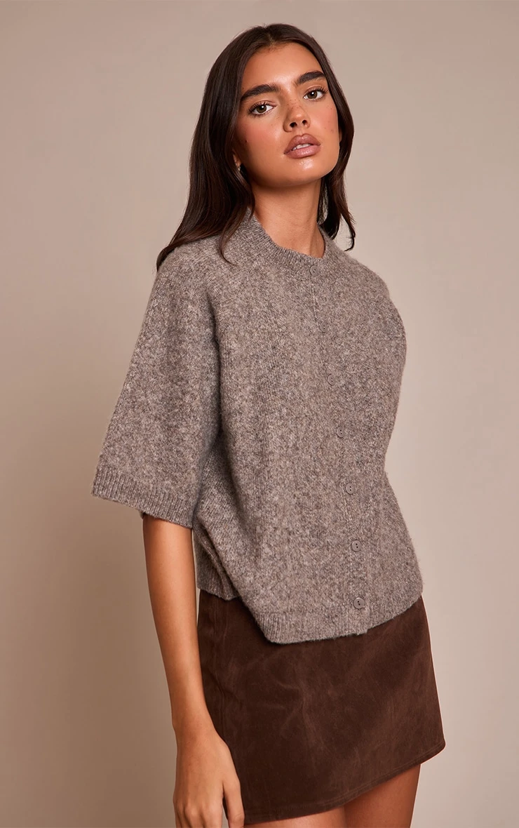 Layer up your look in this taupe soft knit short sleeve cardigan. Brought to you in taupe toned material, this cardigan has value fastenings and chic short sleeves. Add wide leg jeans and sneakers for a look we’re loving right now.
