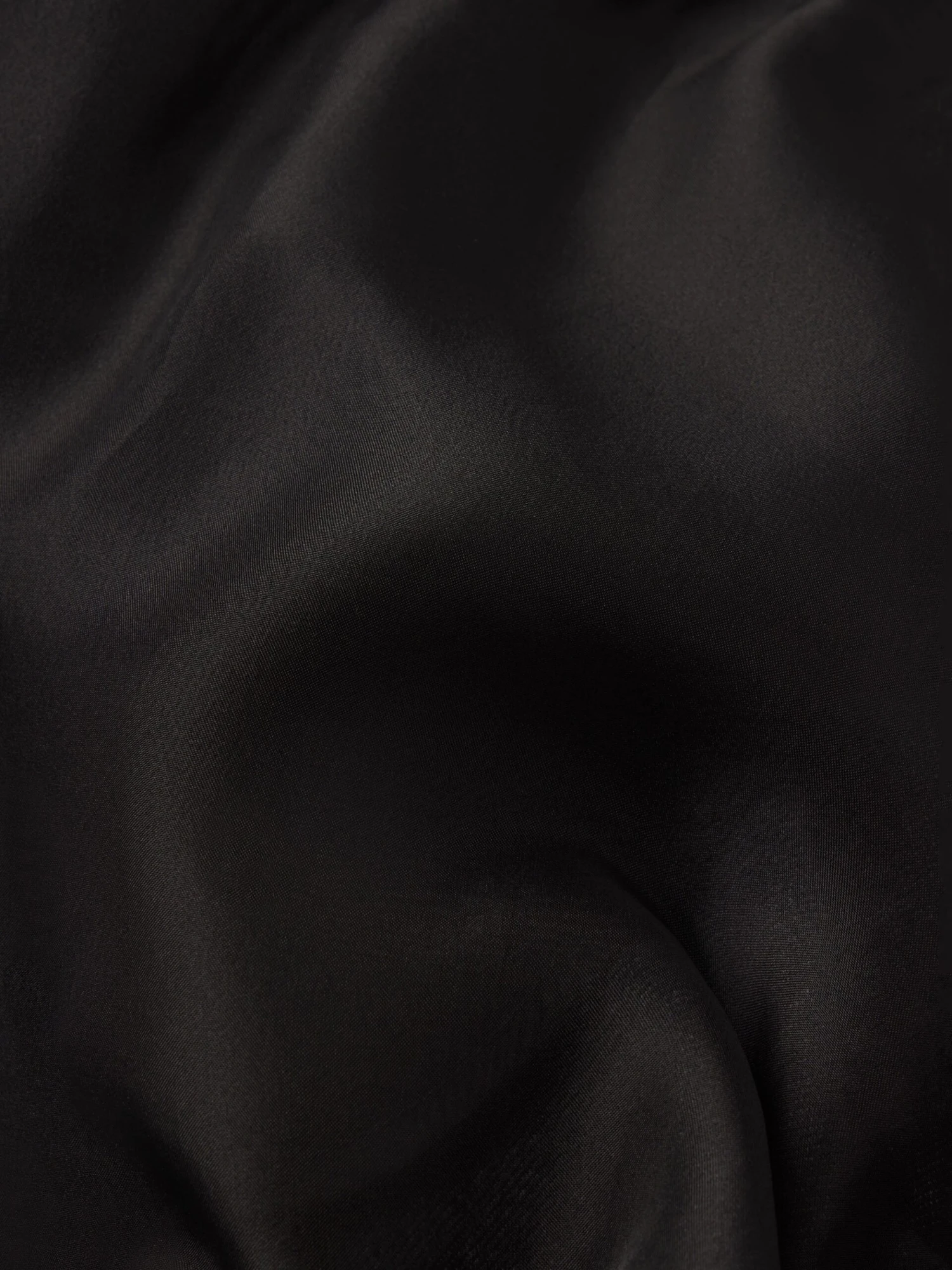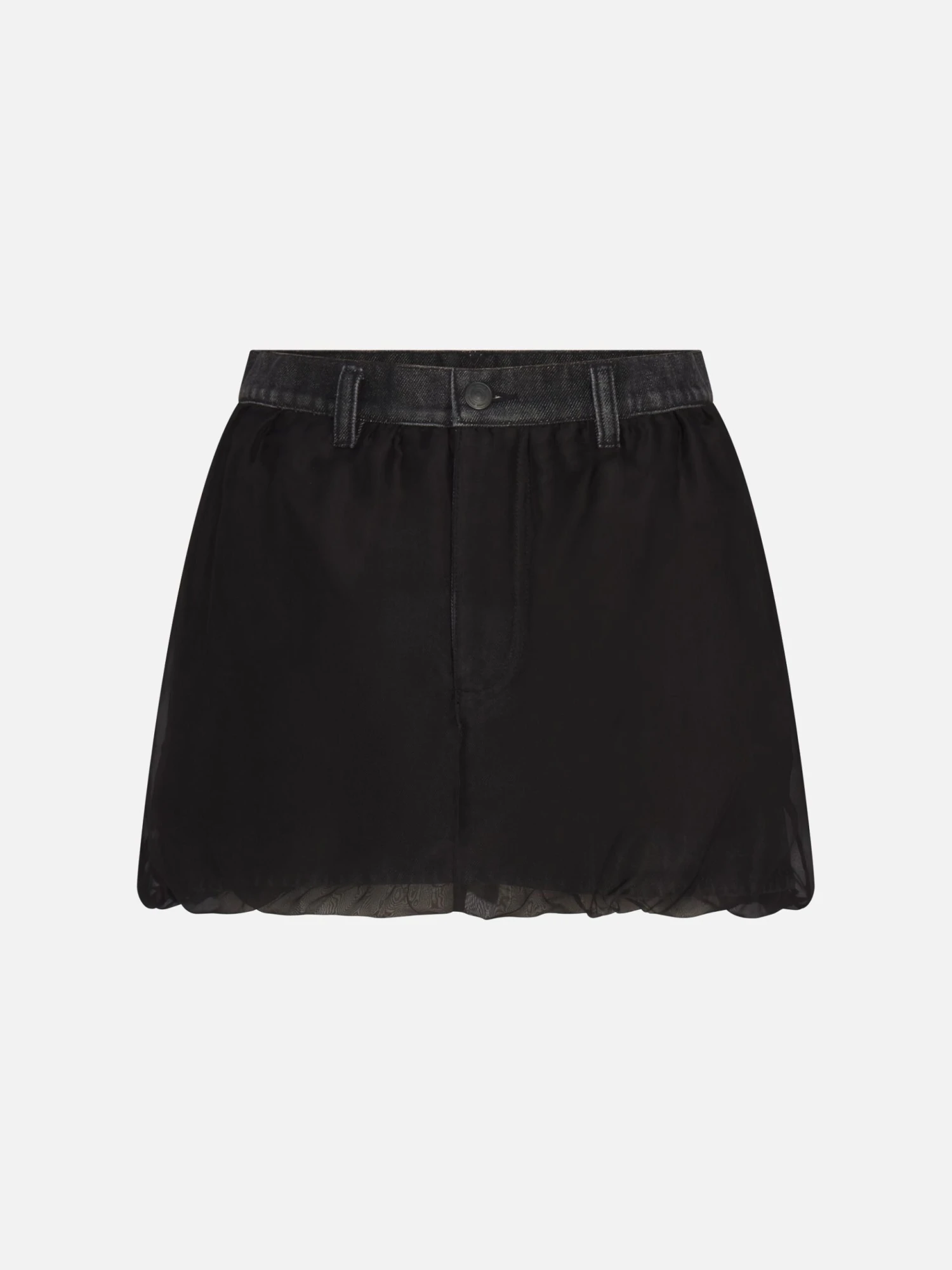 The black miniskirt, reinvented. In this simple yet striking piece, a black non-stretch denim mini is elevated with a silk organza overlay in a bubble shape.