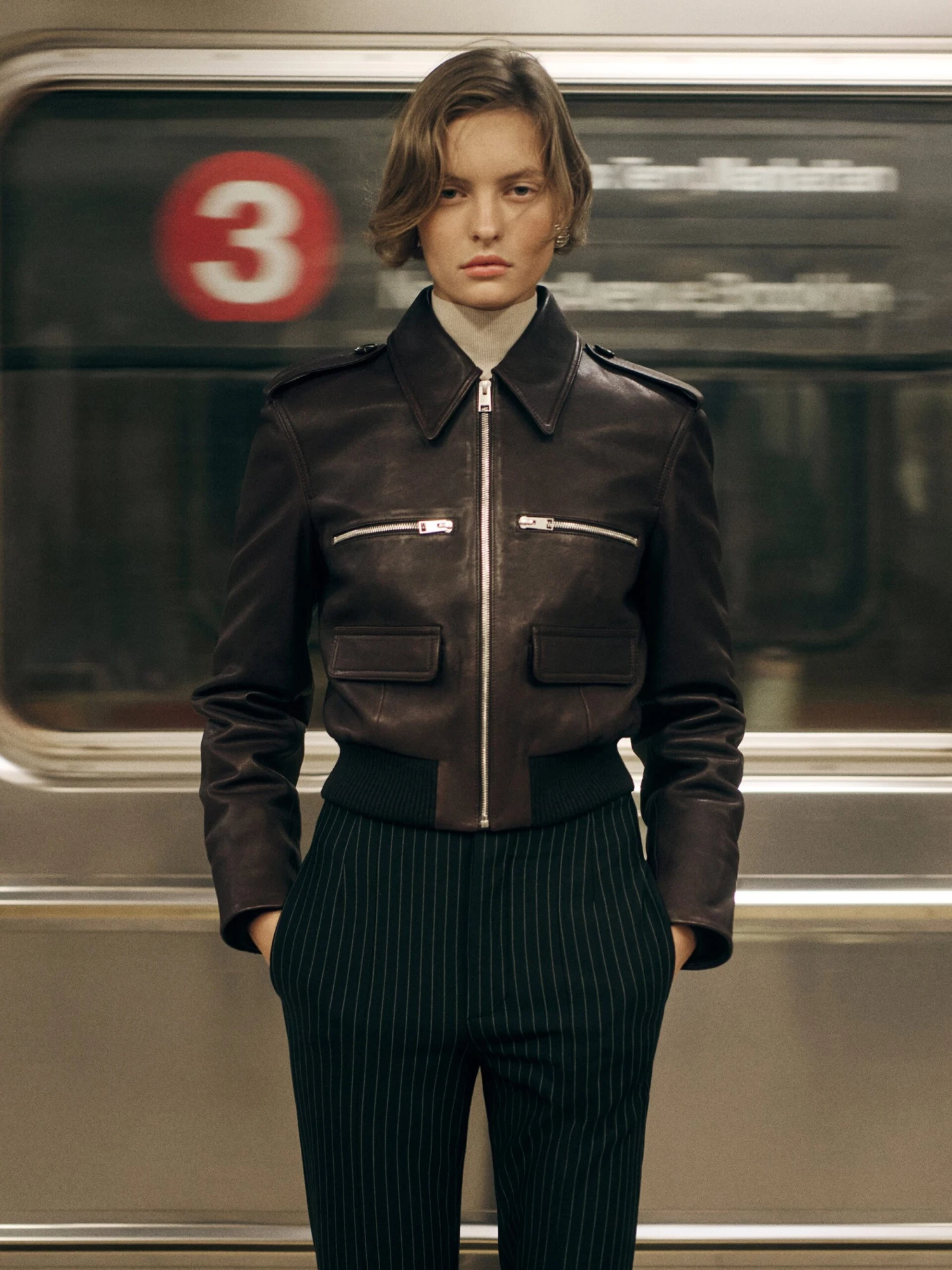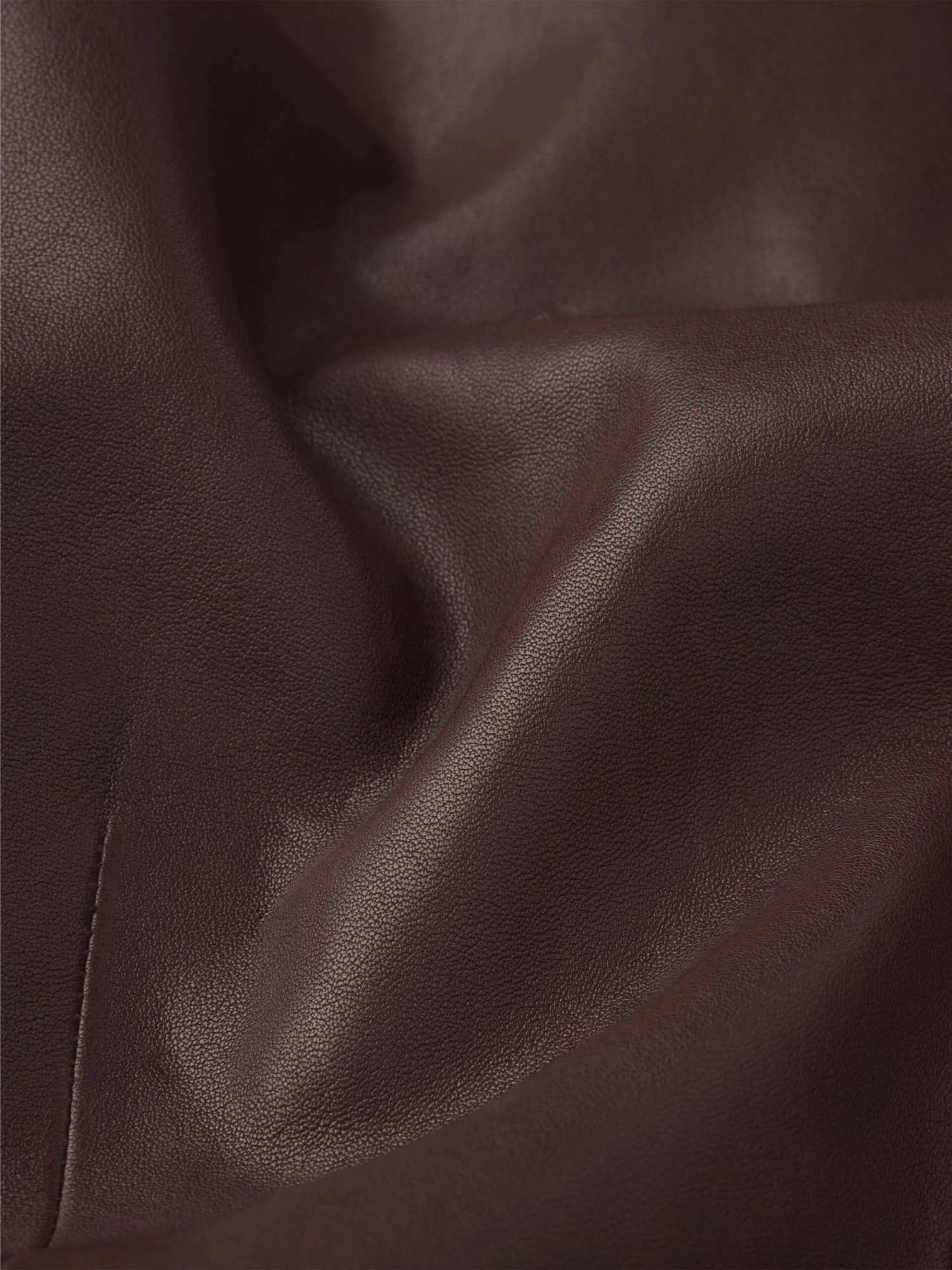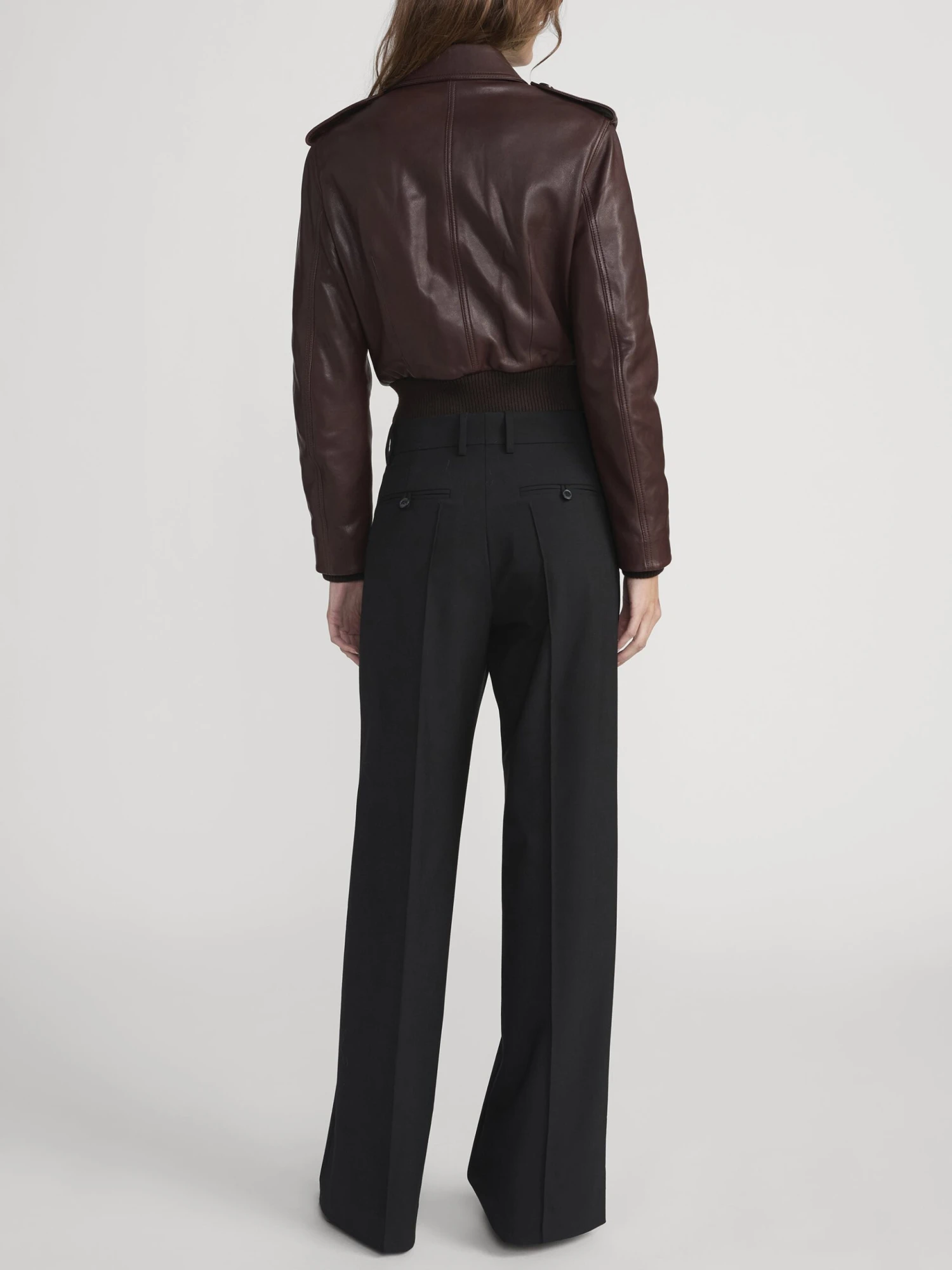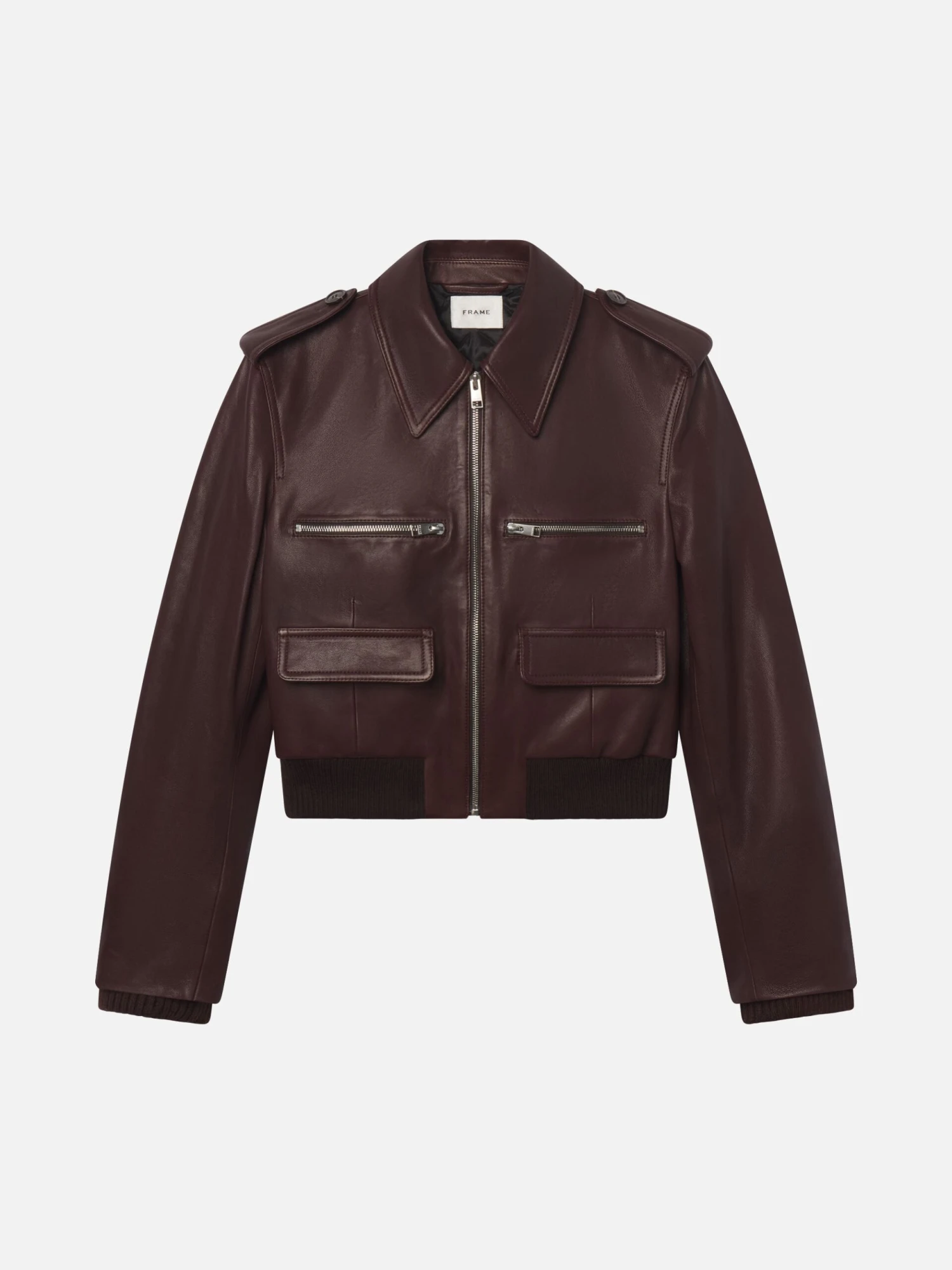 This sleek and polished aviator jacket is crafted from lamb leather in a rich brown hue. Tailored with a shrunken silhouette and finished with black contrast ribbing and uniform-inspired epaulets.