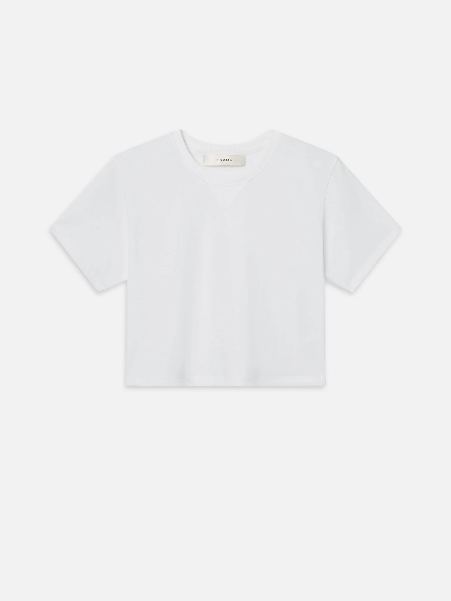 The everyday tee you’ll reach for again and again. Boxy and cropped in midweight organic cotton, designed to skim the waistband and finished with a classic V-insert detail that nods to vintage athleticwear.