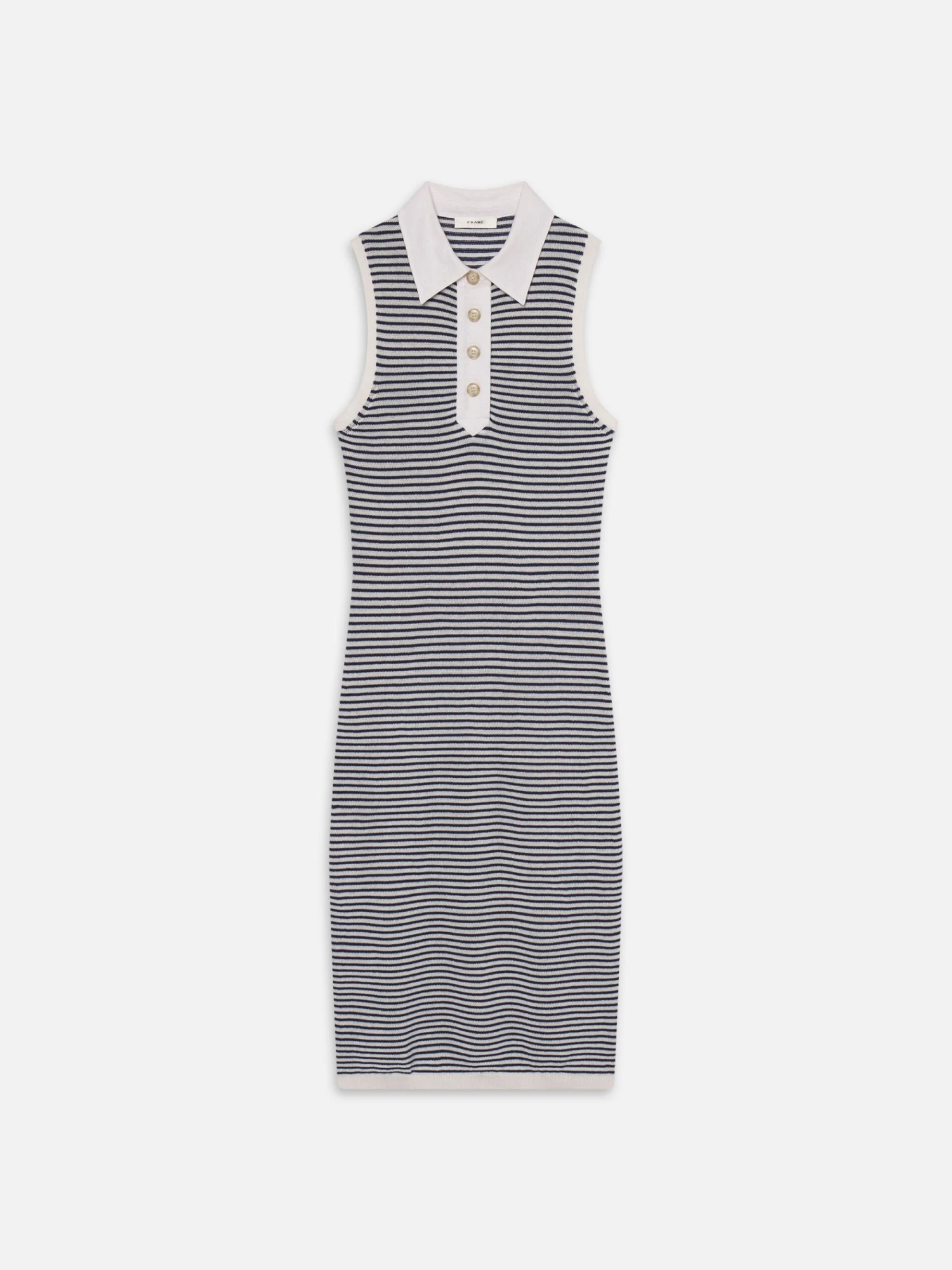 Crafted in cotton, cashmere, and linen, The Bold Stripe Dress is a triple threat. The sleeveless design features contrast fabric at the collar and summary placket, as well as a navy stripe motif—perfect for the coastal prep moment that’s taking over summer.