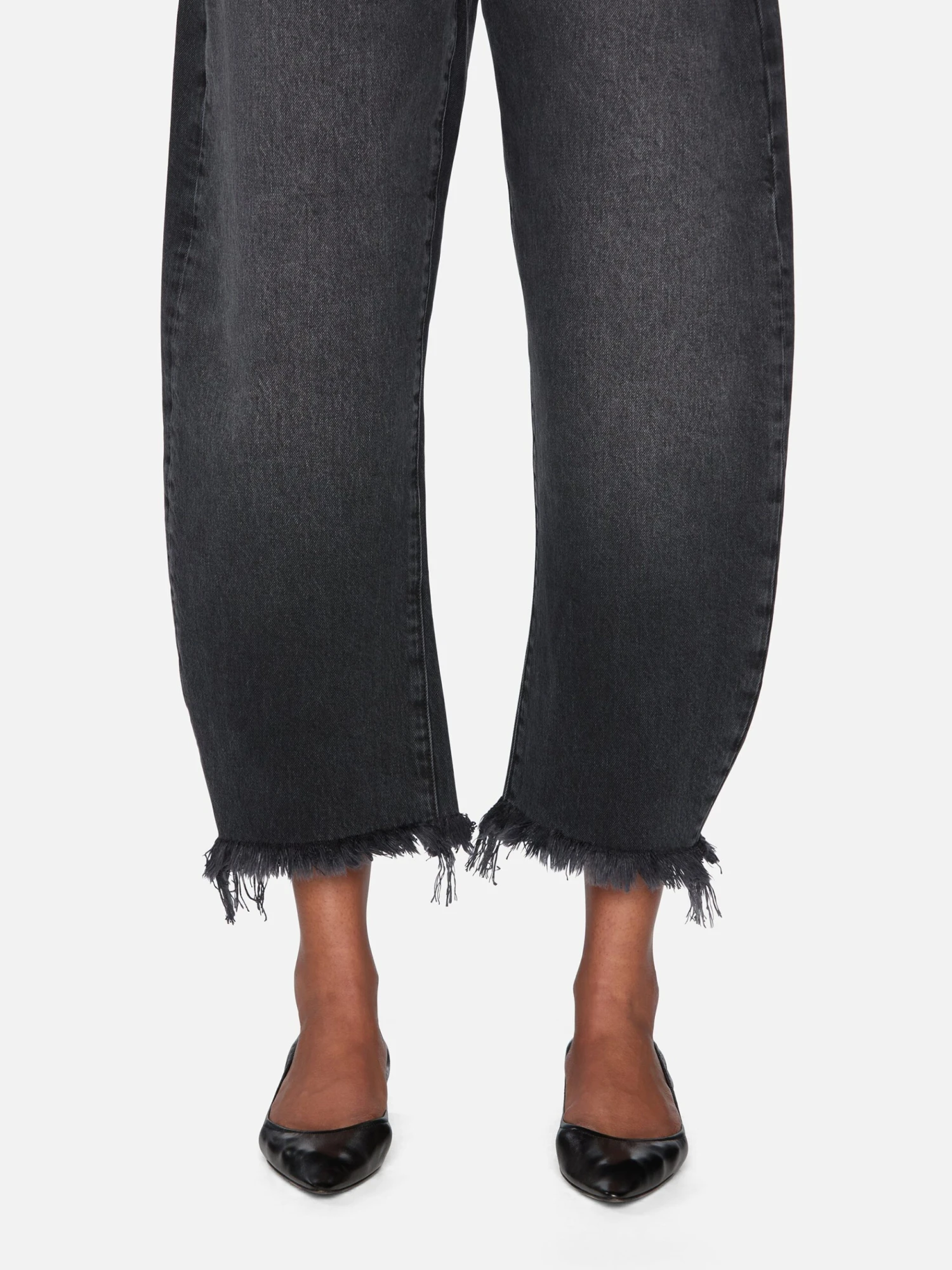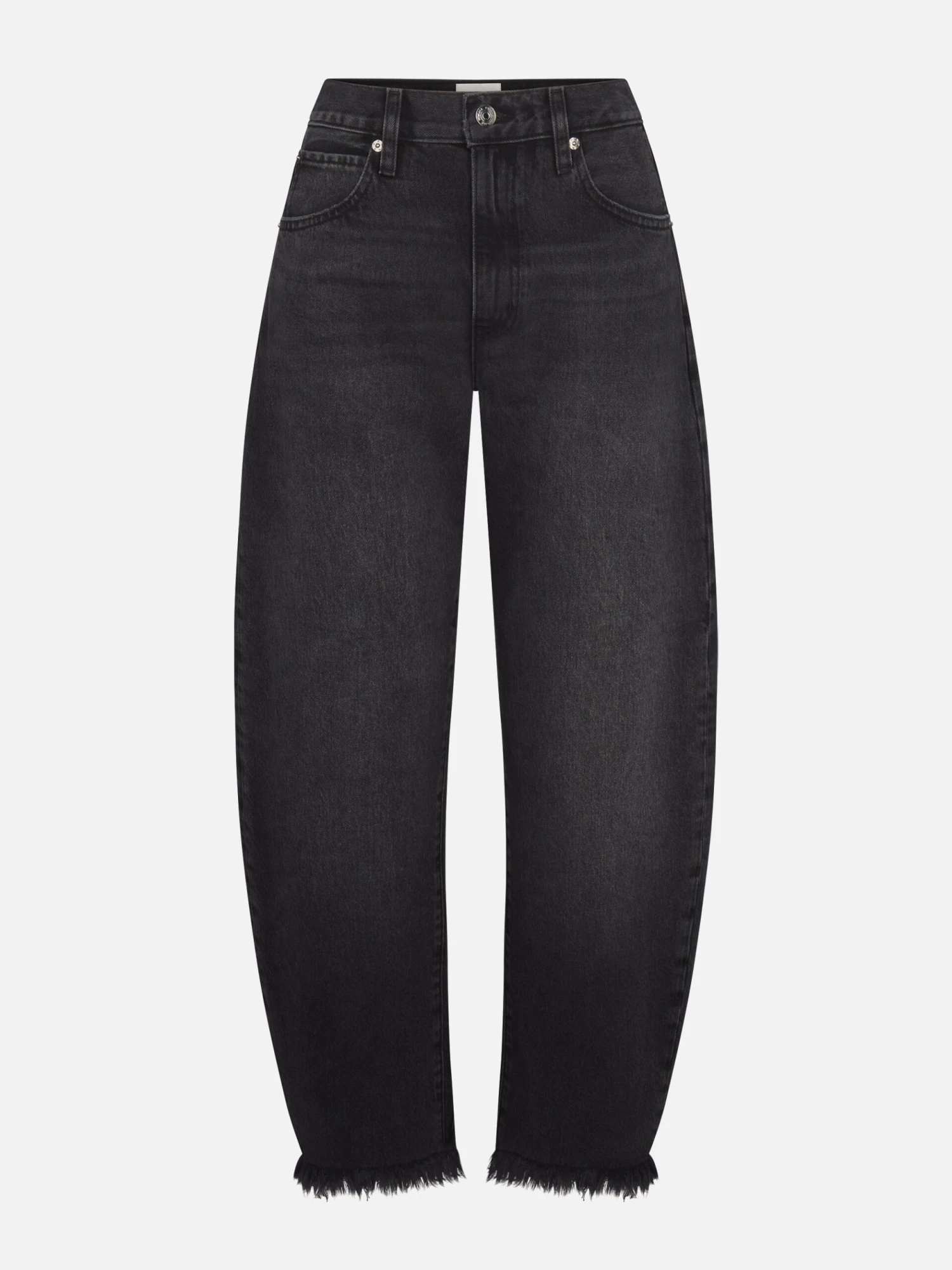 The best-selling Bubble, now with a shorter 27″ inseam. The exaggerated take on the trending barrel silhouette is a unique fit and instant closet necessity. With a flattering high rise, these jeans have a curved outseam for a playful bubble effect. Note the dark wash and raw, fringed hem for a pre-loved look.