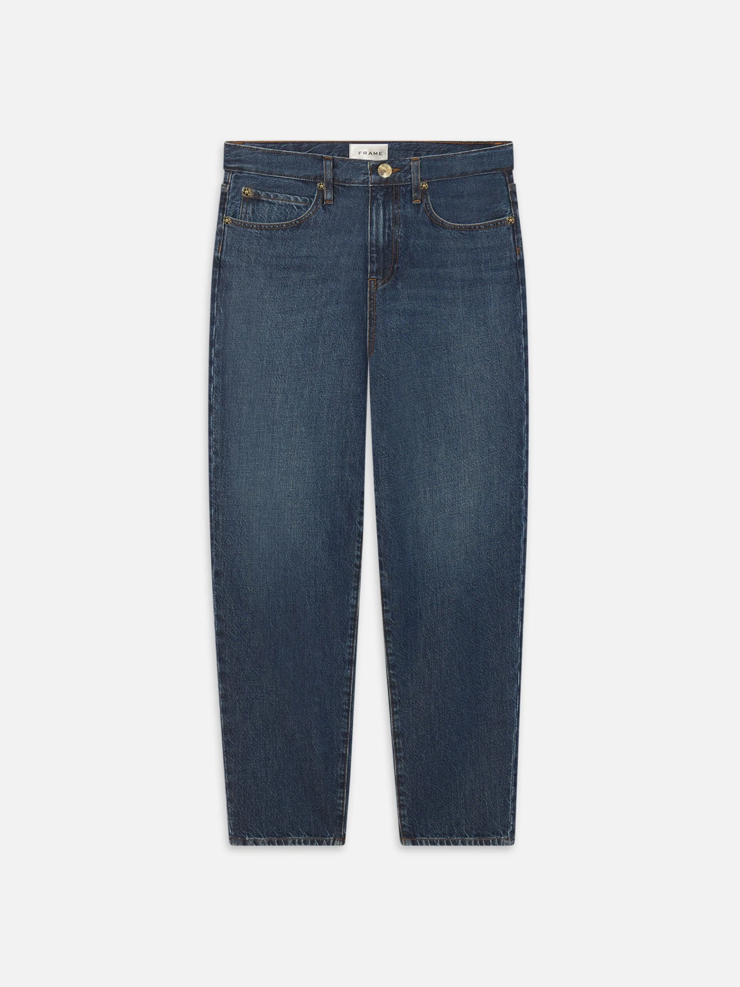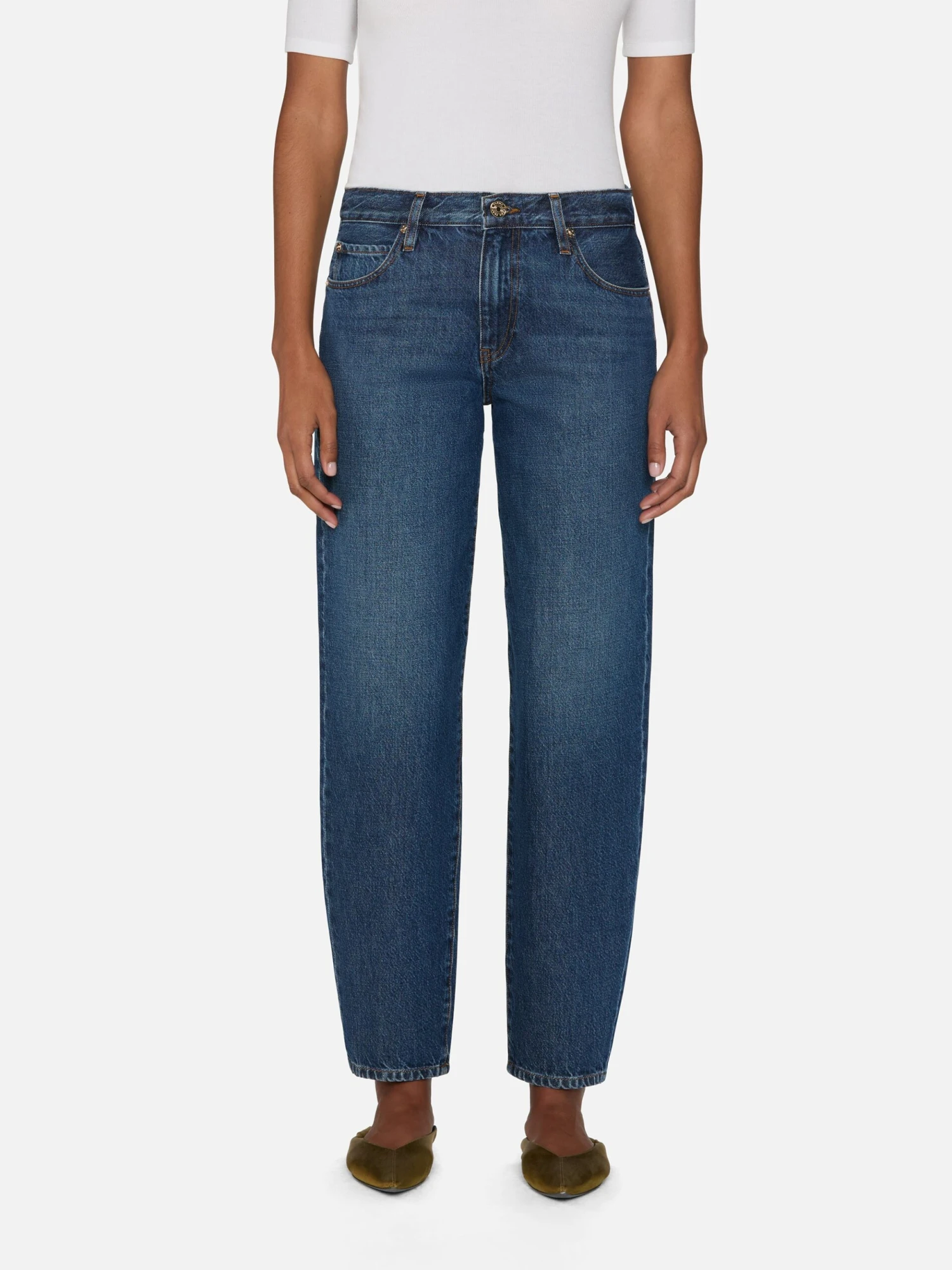 Crafted from 100% sustainable cotton, this rigid pair offers a softer take of the barrel-leg craze. It has a mid-rise waist and delicately curved outseam that hits at the ankle—perfect for a polished kitten heel.