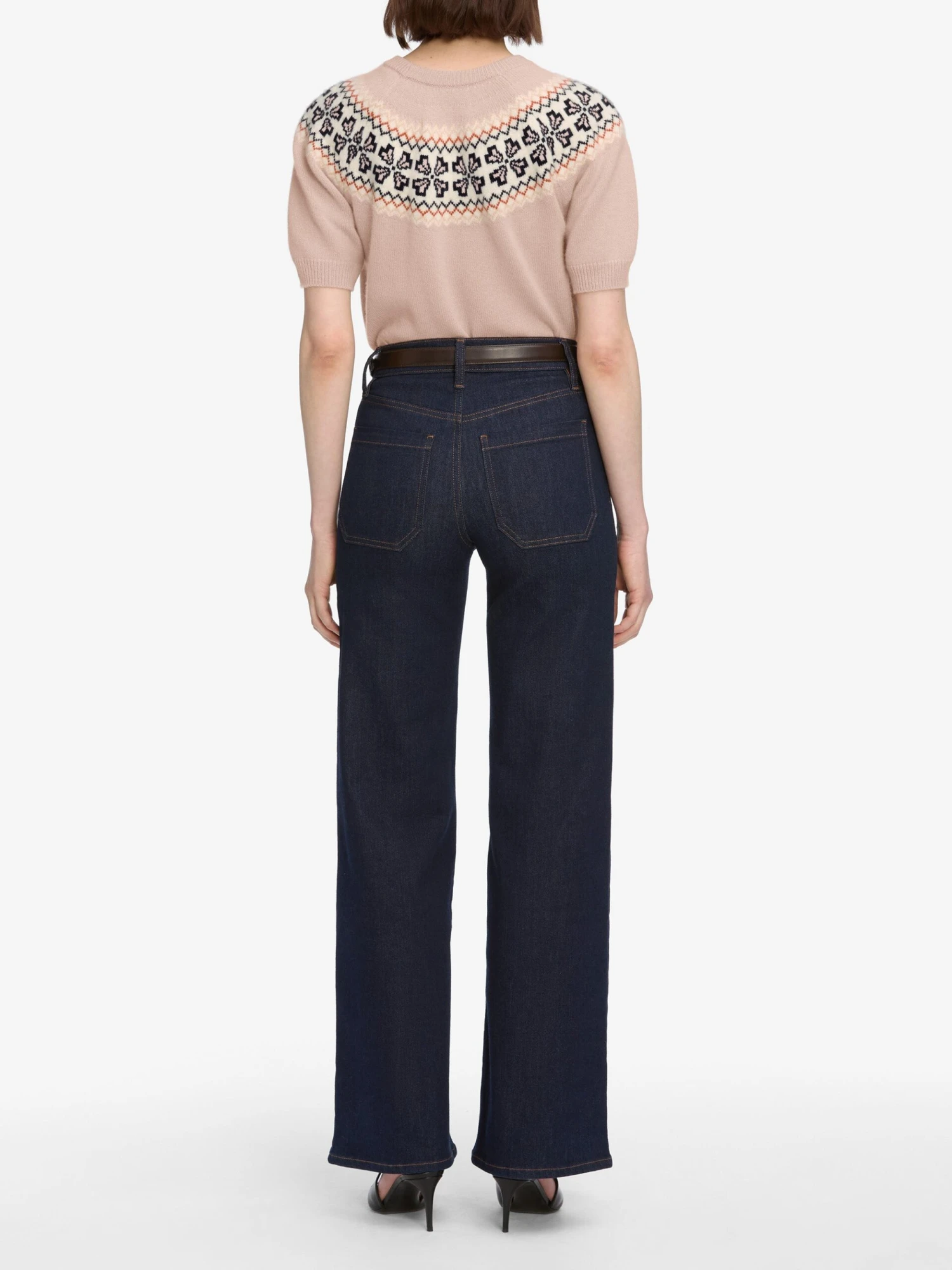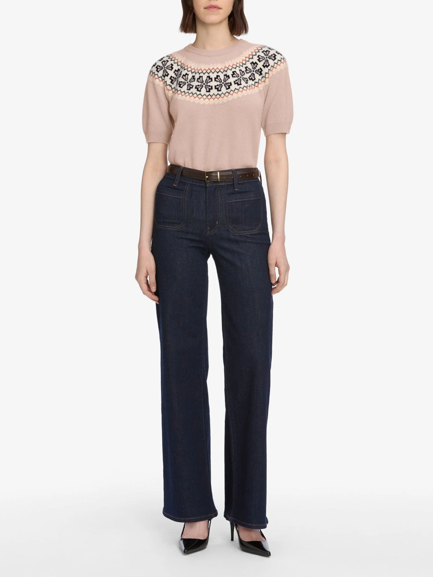 A femme take on traditional Fair Isle knitwear. This short sleeve sweater, in gorgeous soft pink cashmere, adds a touch of character to your wardrobe.