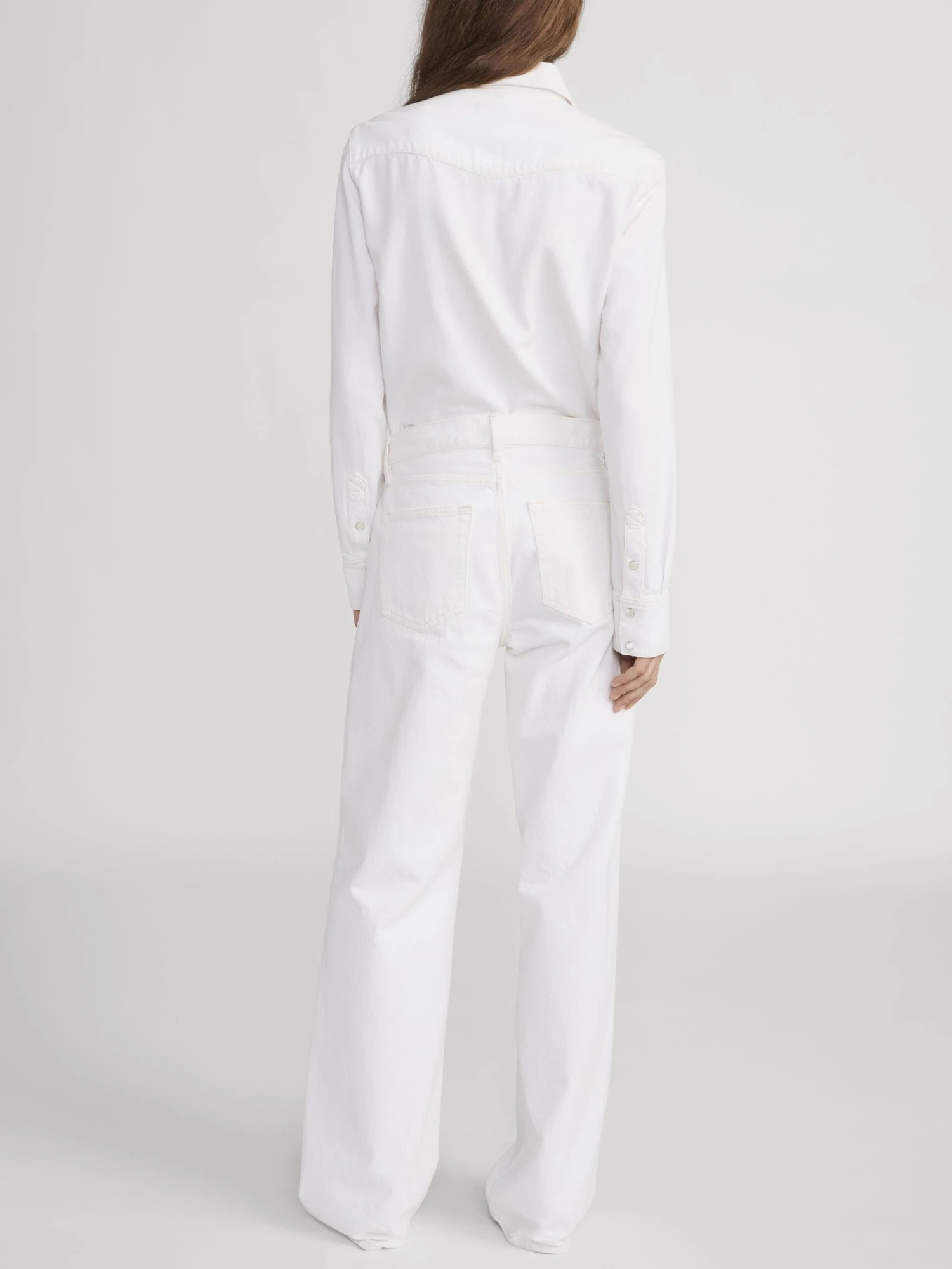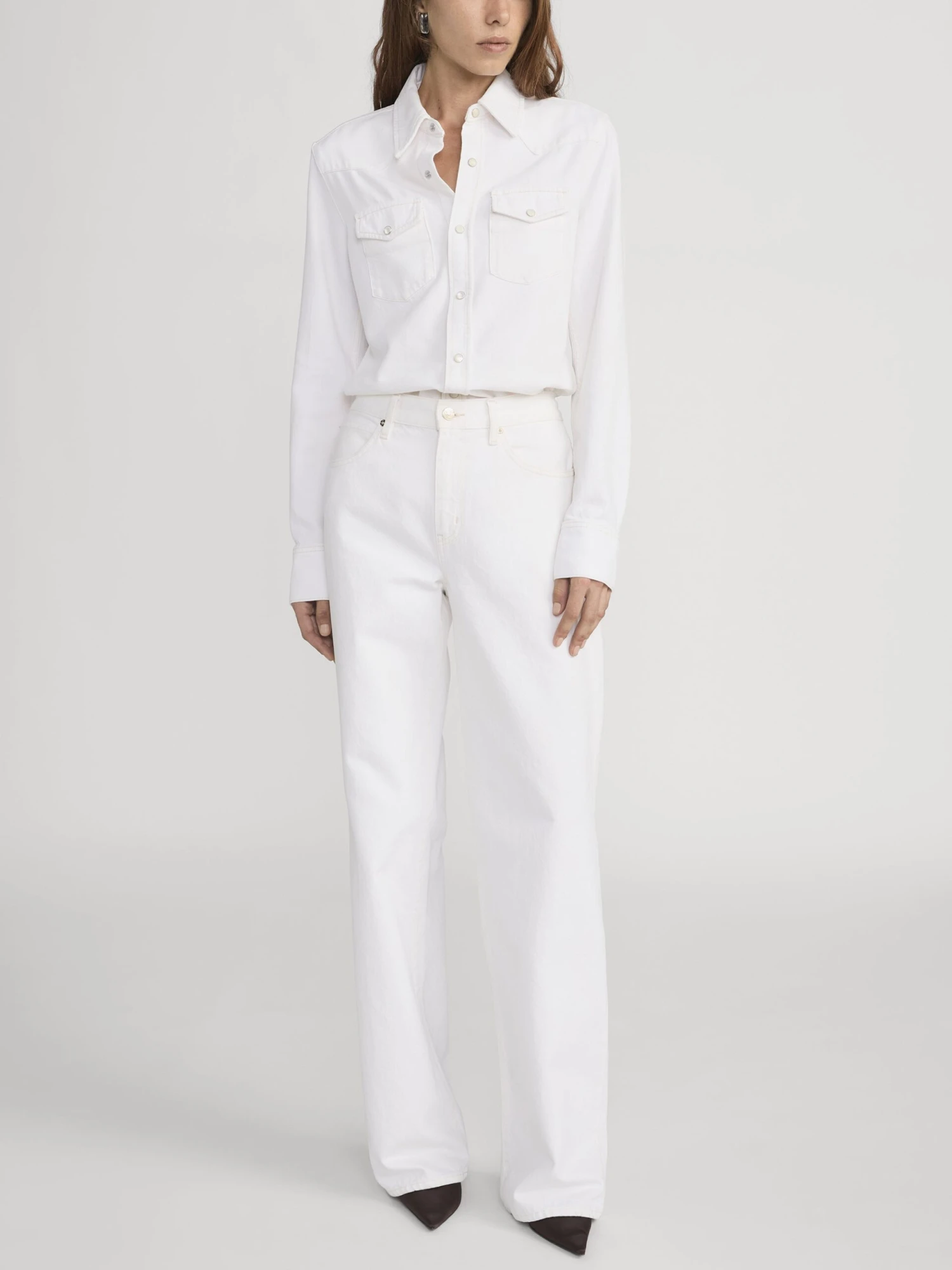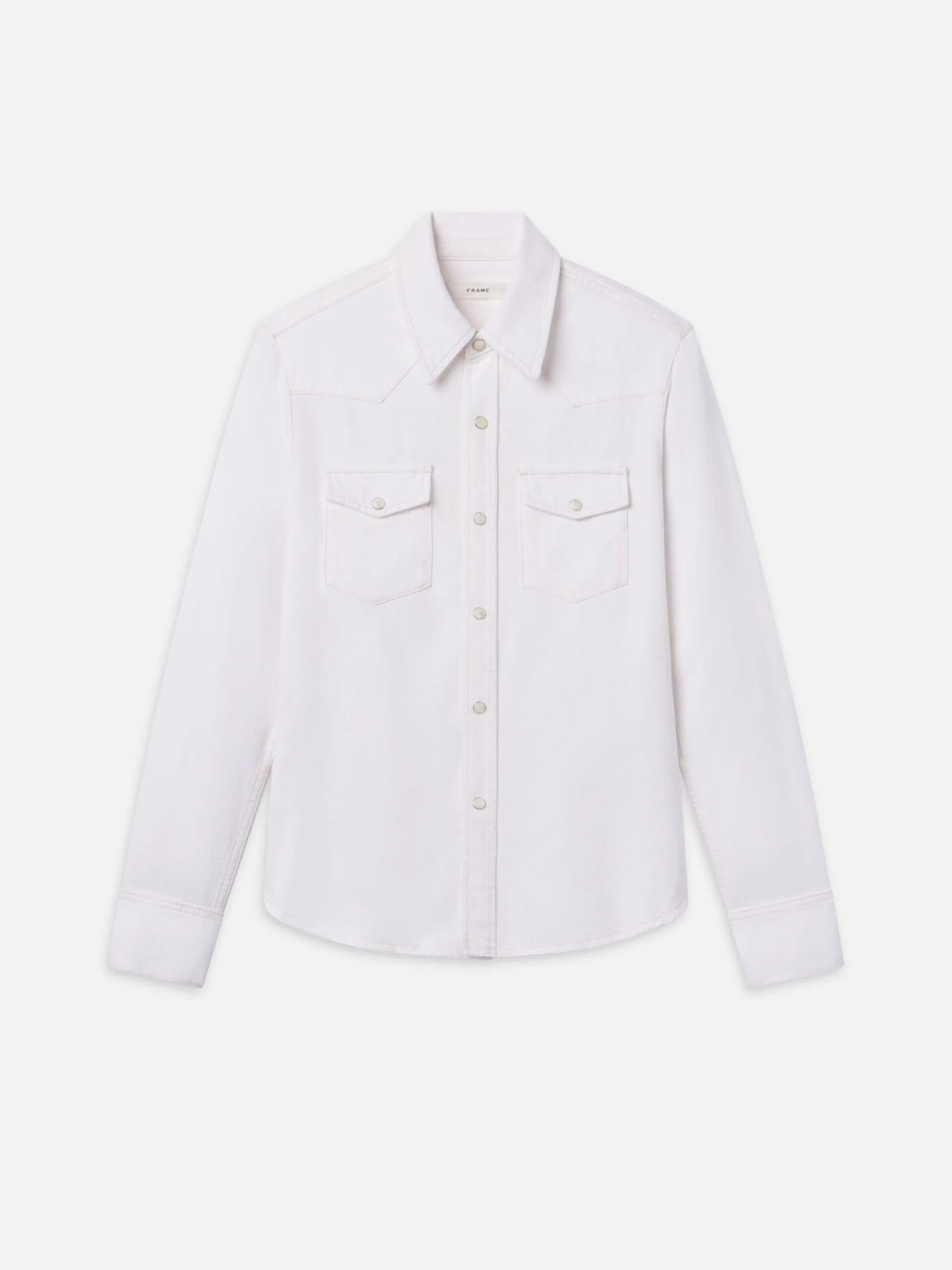A classic rigid denim shirt with Western-inspired, pearl-finish snaps. Slim cut for a fitted look. Â