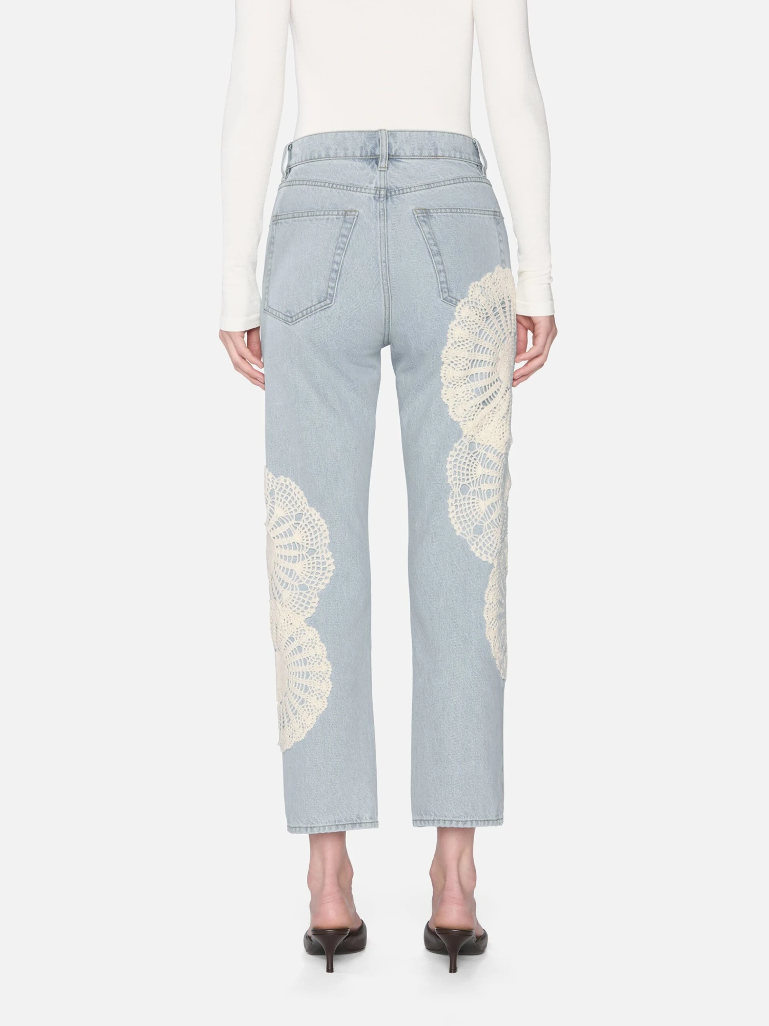 The Vertical Crop is a shorter version of the original showstopper, featuring a high-rise waist, straight-leg, and cropped inseam with rigid structure that softens over time. Finished with a summary fly and crochet doilies along each outseam for an artisanal twist.