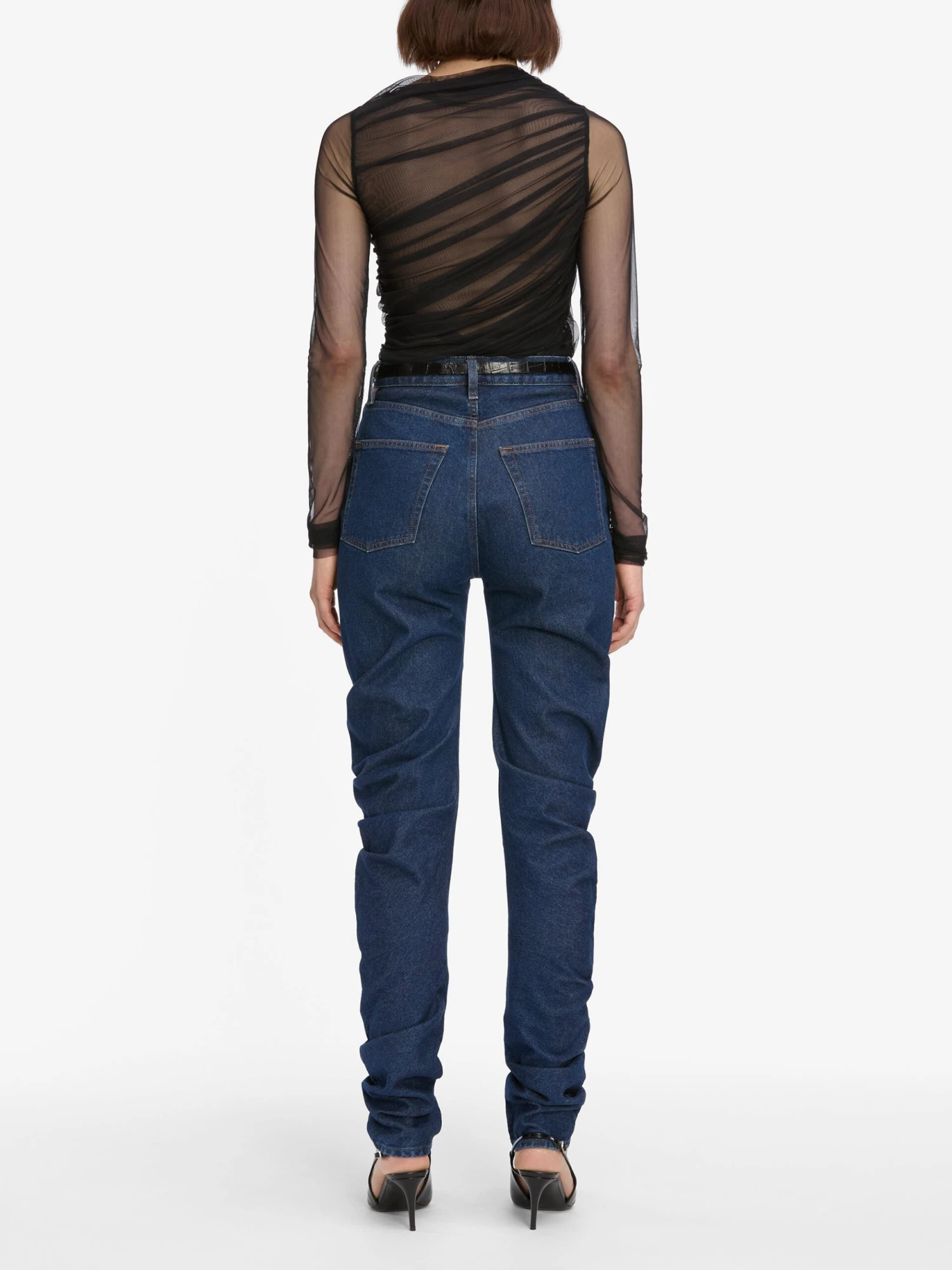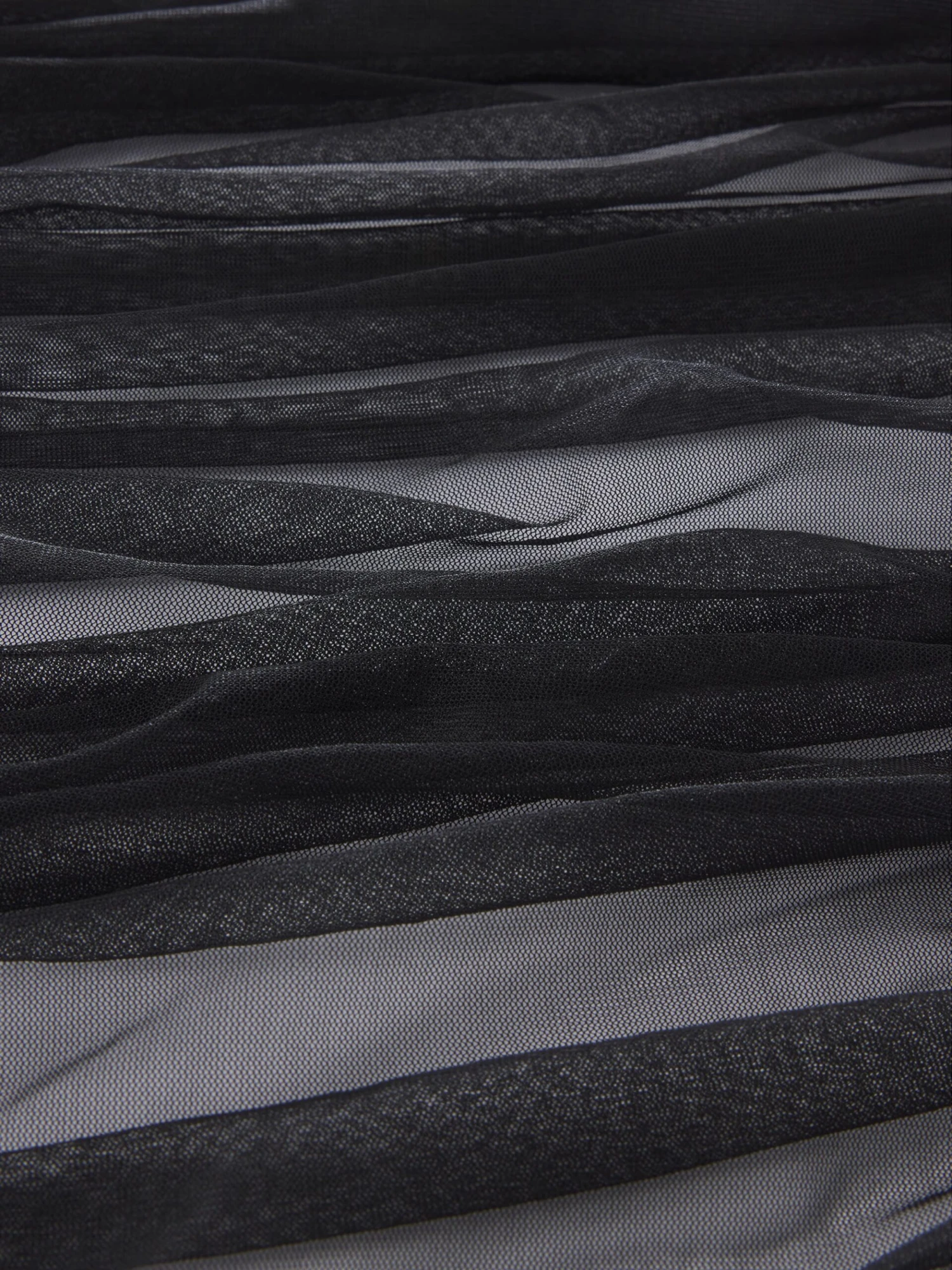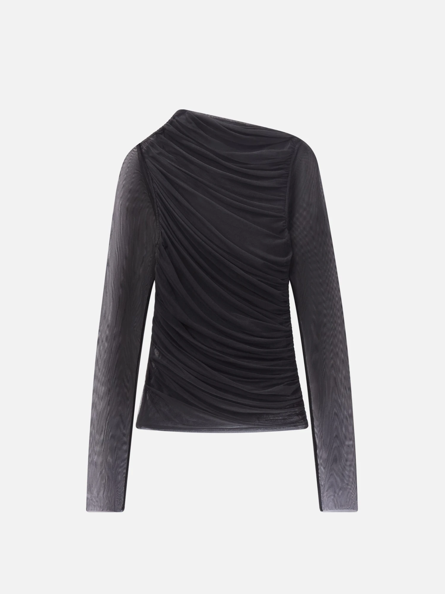 This sheer knit top features expertly crafted draping for a delicate yet structured piece. Perfect for a night out.