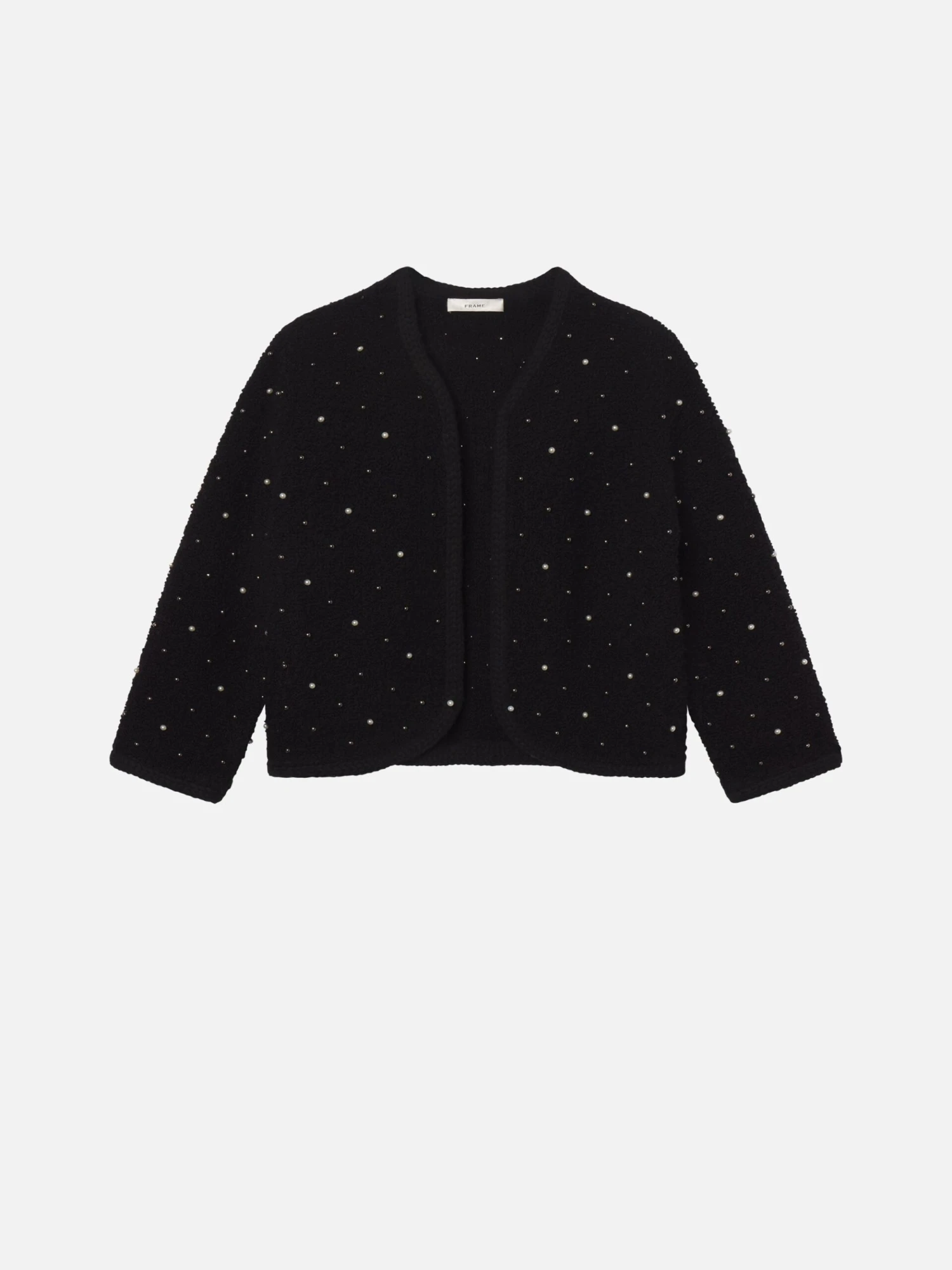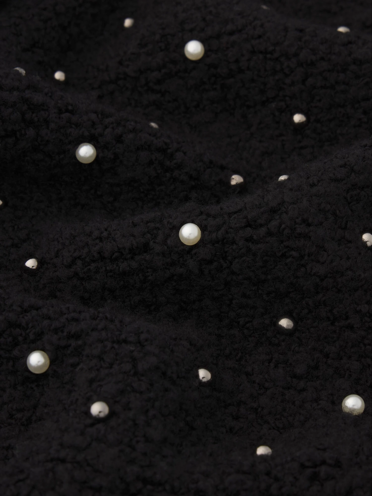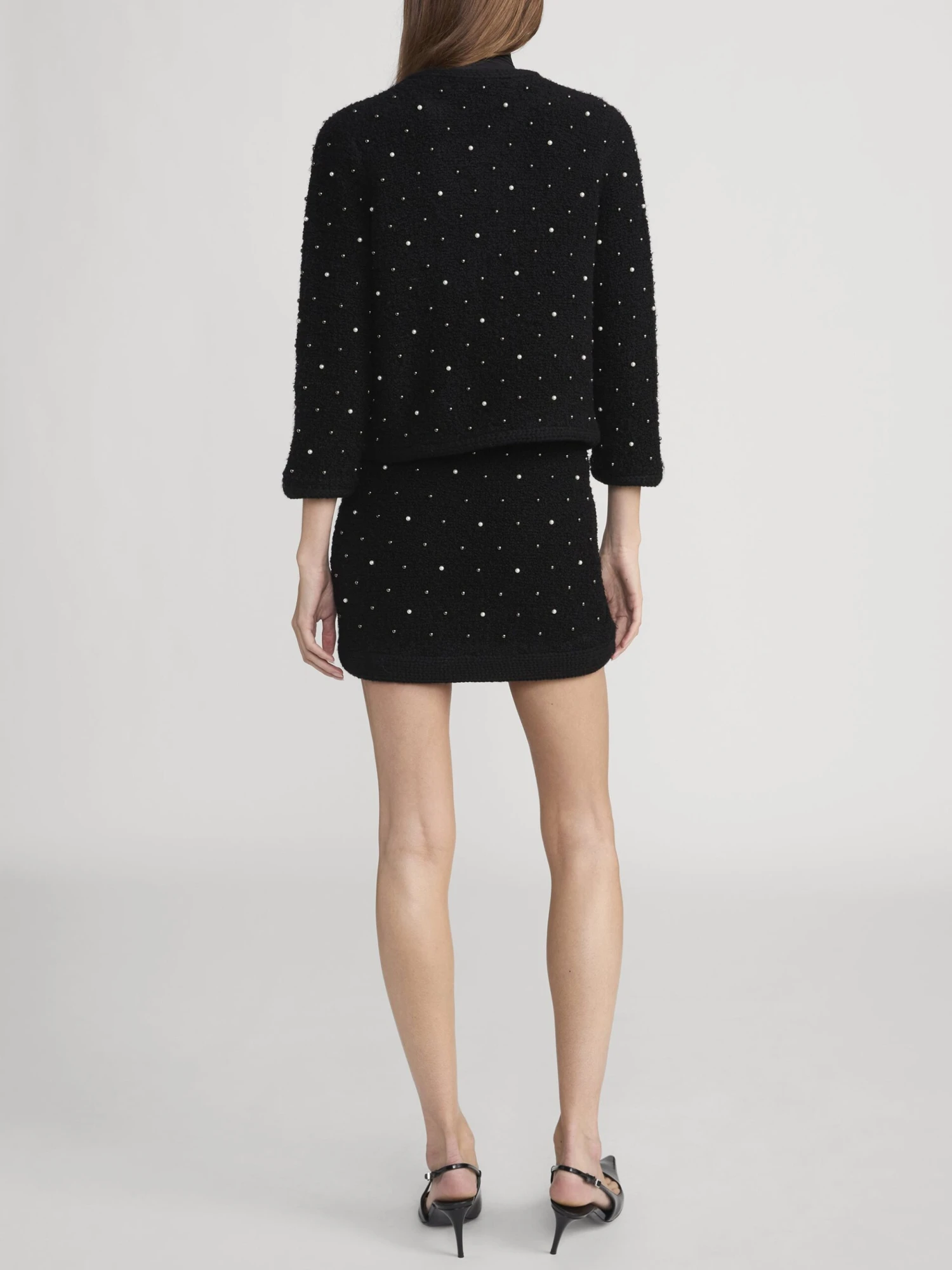 This classic yet modern knit is embellished with pearls and rhinestones throughout. The silhouette features delicate three-quarter length sleeves and no closure. Pair with The Embellished Skirt for the full look.