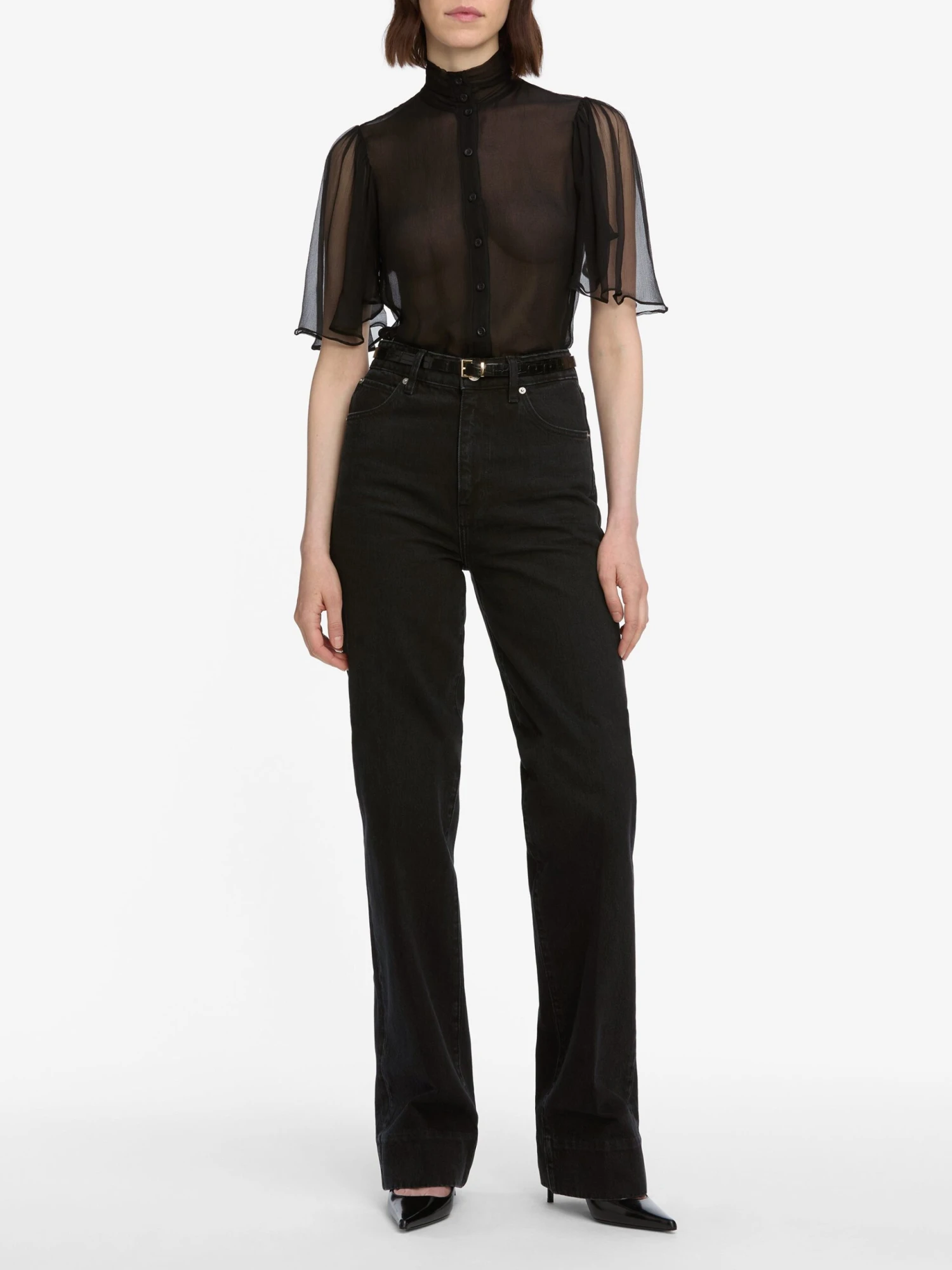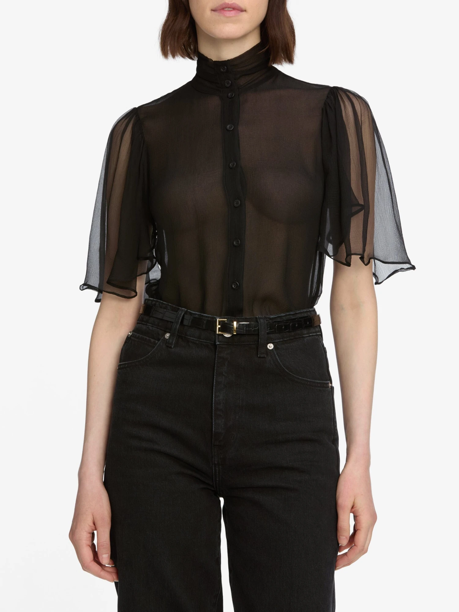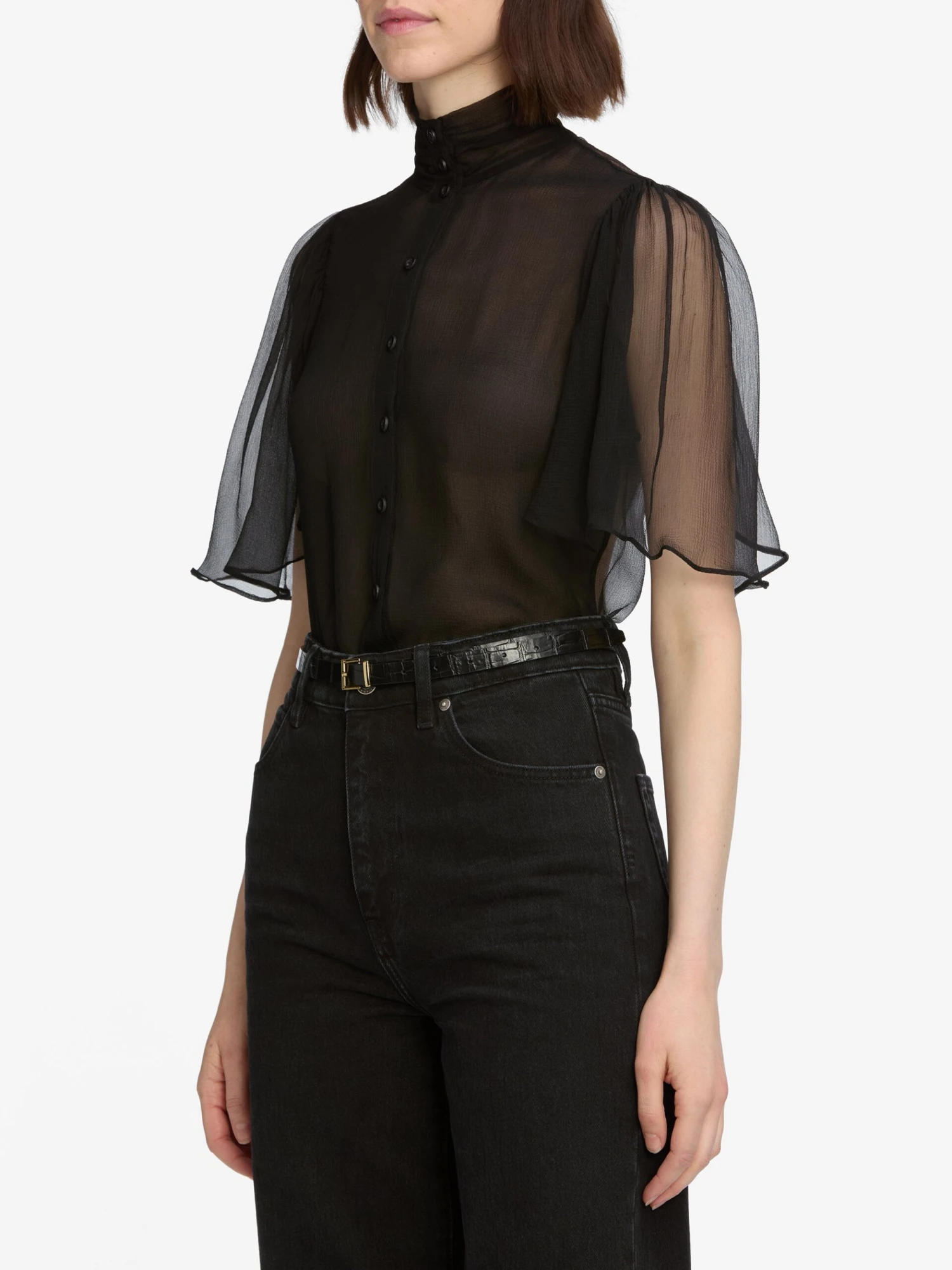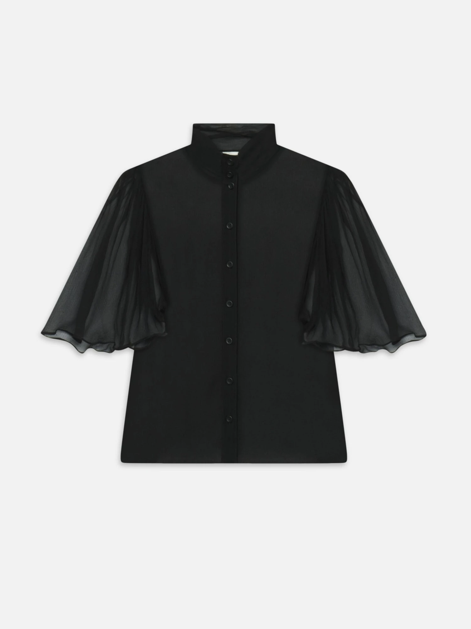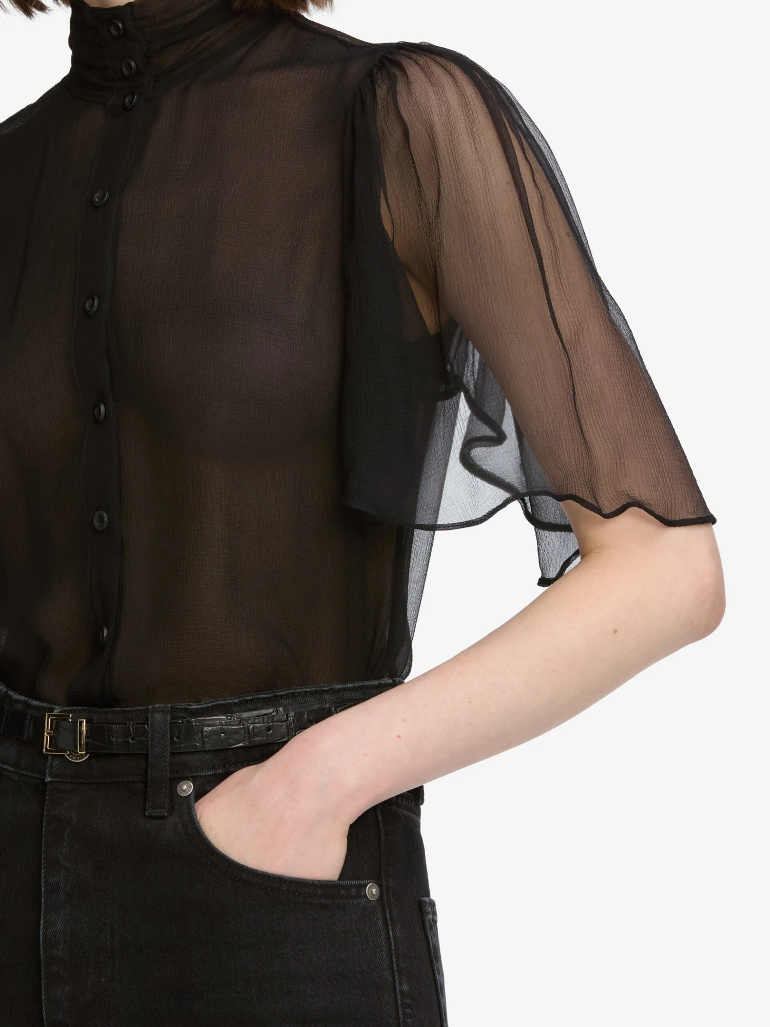 A featherweight silk blouse with sheer flutter sleeves that give a soft, airy quality. Full length and lined, yet still semi-sheer, through the body.