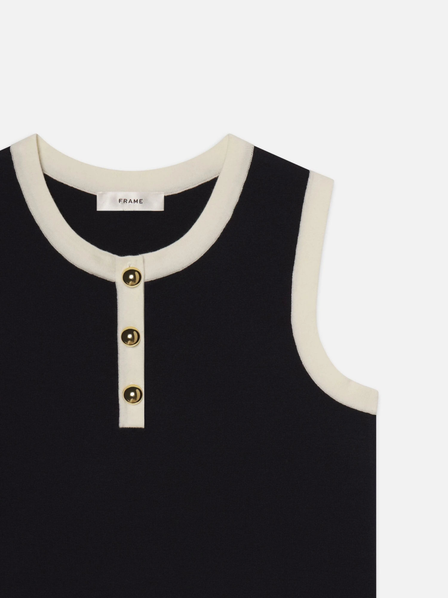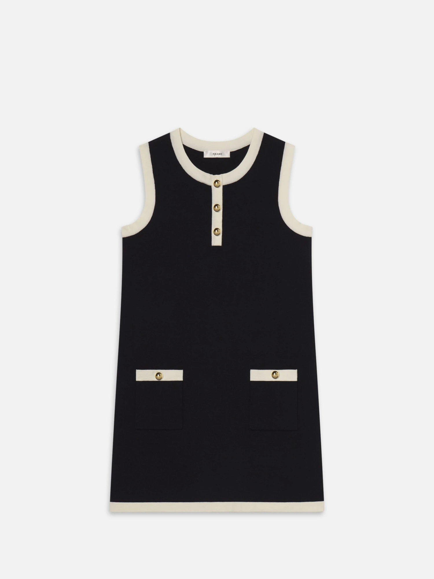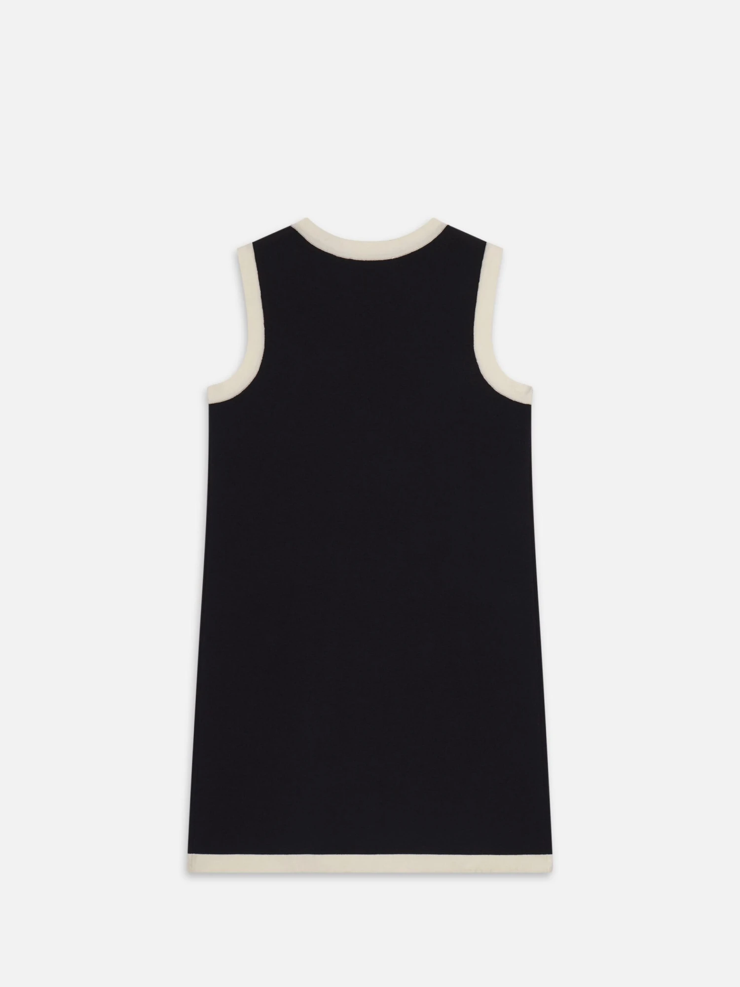 Crafted in soft merino wool with cotton-blend trim, The Mixed Dress enhances a navy knit body with cream accents and gold summarys. Sleeveless and subtly structured, it blends polish and ease in a summer shift.