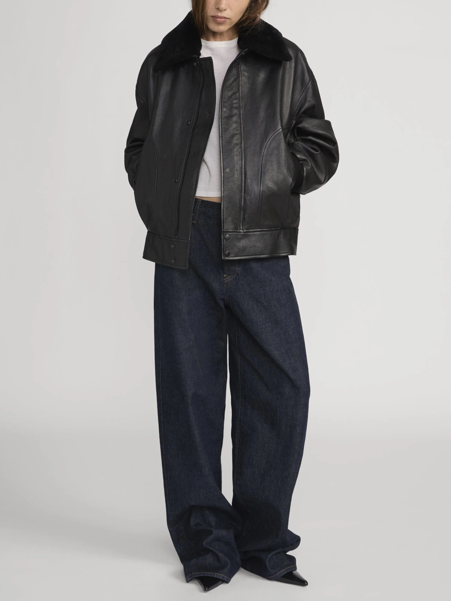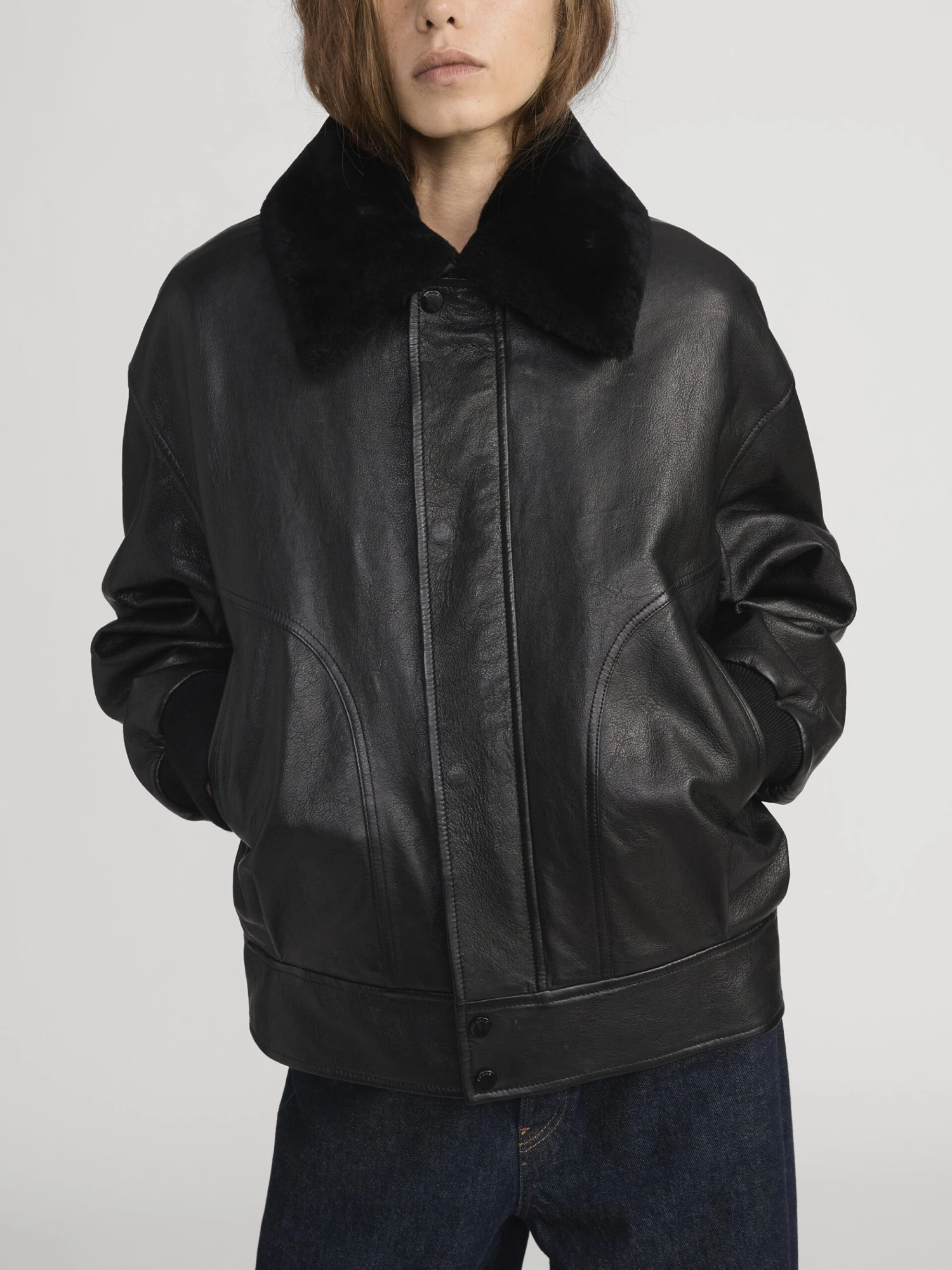Crafted from smooth lamb leather, this bomber jacket nods to iconic aviation styles with modern refinement. The shearling collar adding the perfect amount of plushness for a winter evening. An easy to style piece that elevates both daytime denim and eveningwear.