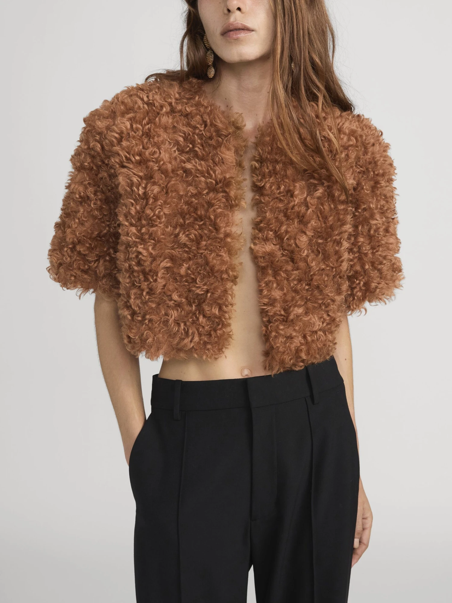 A statement layer with modern glamour, The Plush Bolero features a faux curly texture, cropped silhouette, and open front for an effortlessly elevated finish.