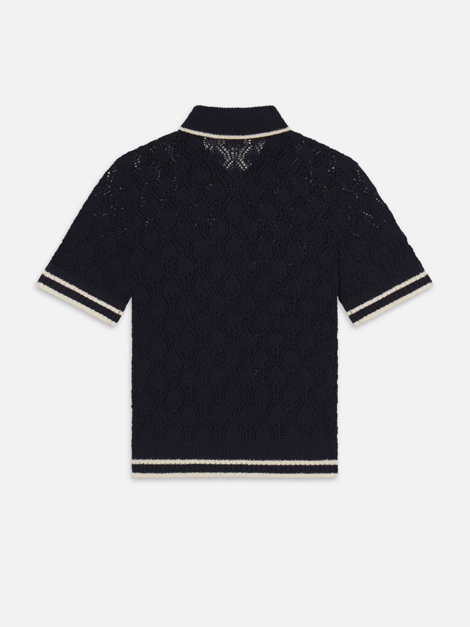 The Rookie Polo is knit with a loose, airy stitch and finished with gold summarys and contrast white trim. A soft take on a sport classic—smart, slouchy, and ready for summer days.