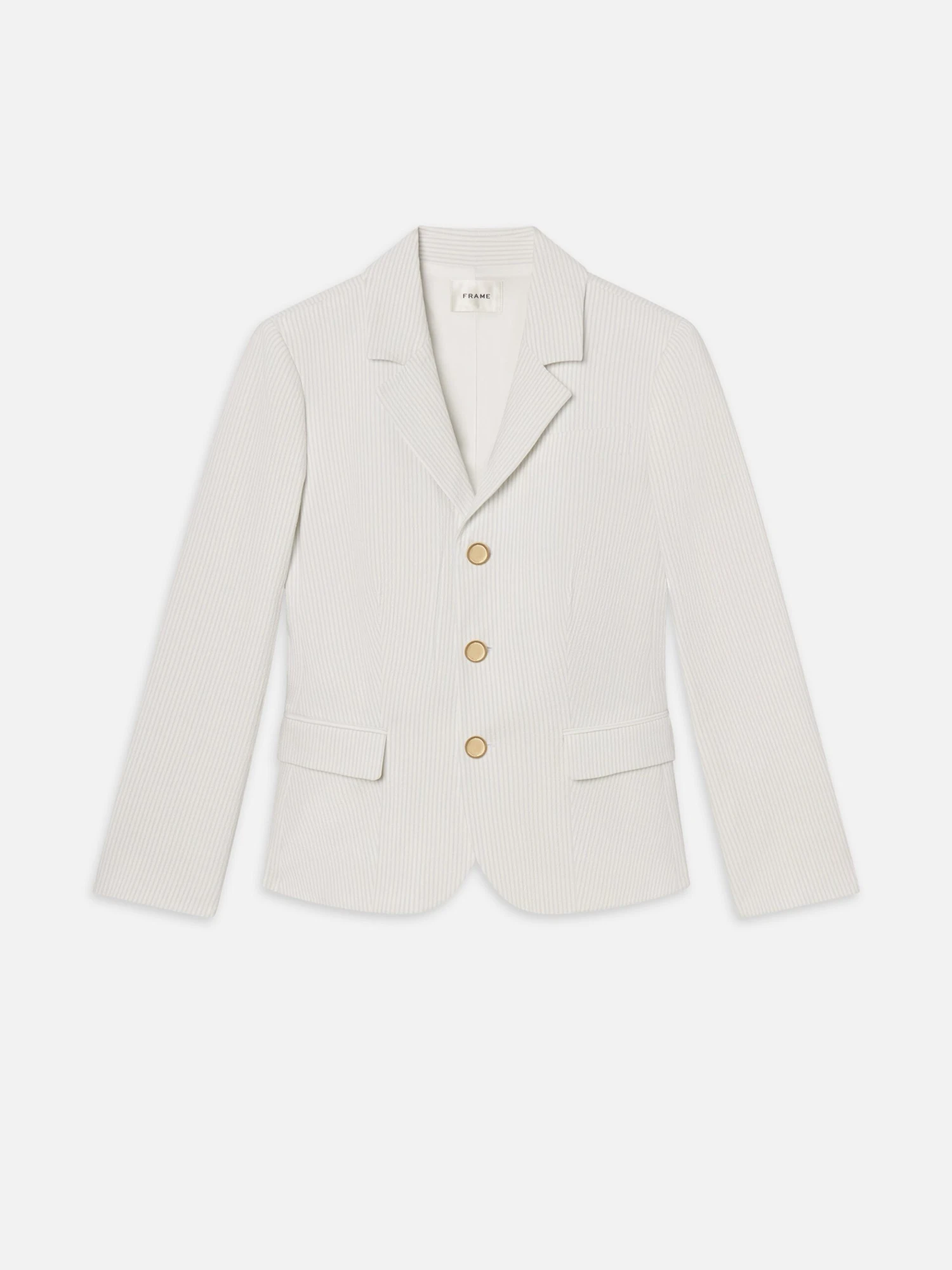 Crafted in a textured seersucker fabric, this blazer features a subtle cinch at the waist and gold summarys. It’s styled best with the matching Slim Palazzo Modernist Pocket Pant.Â