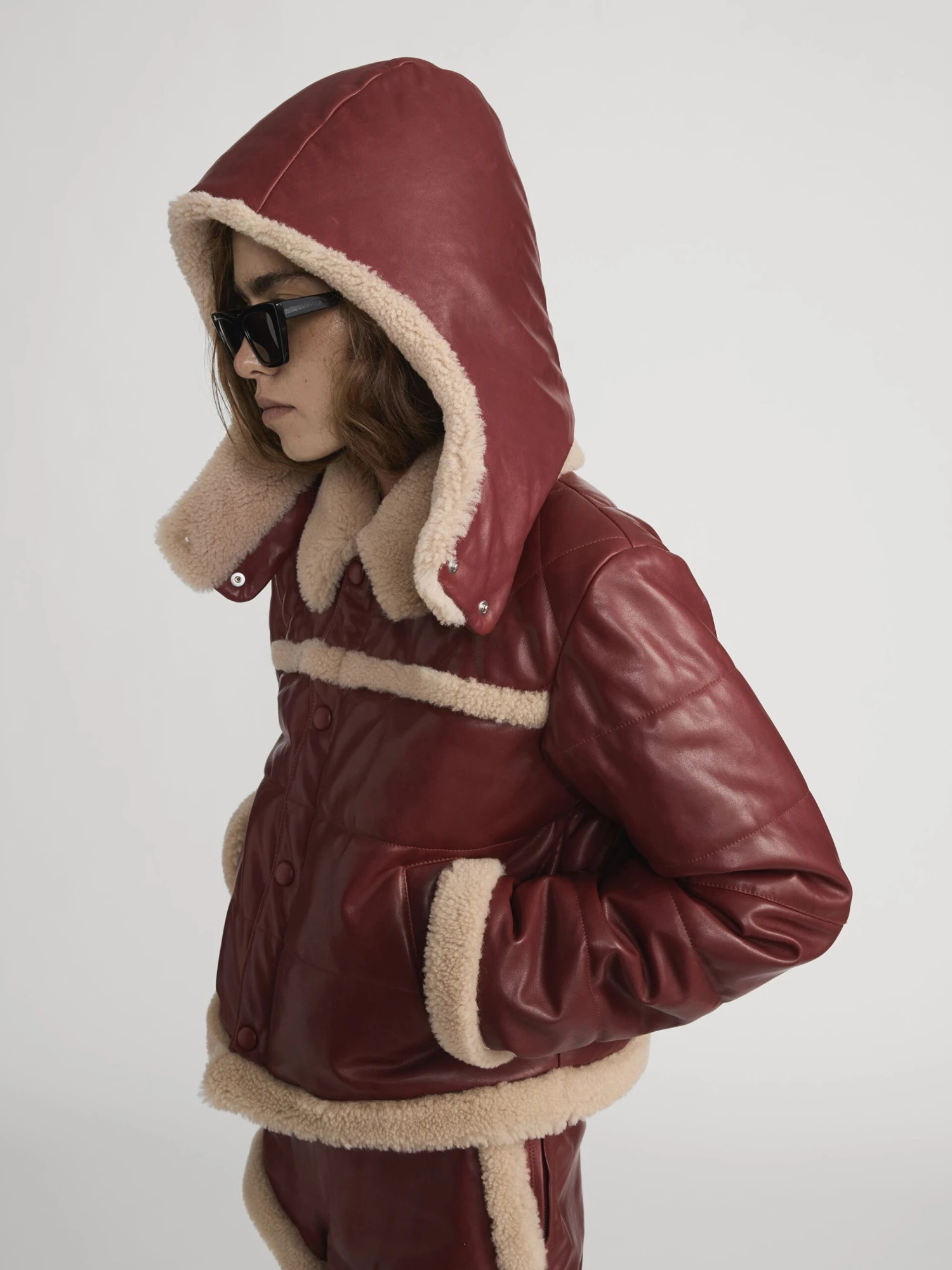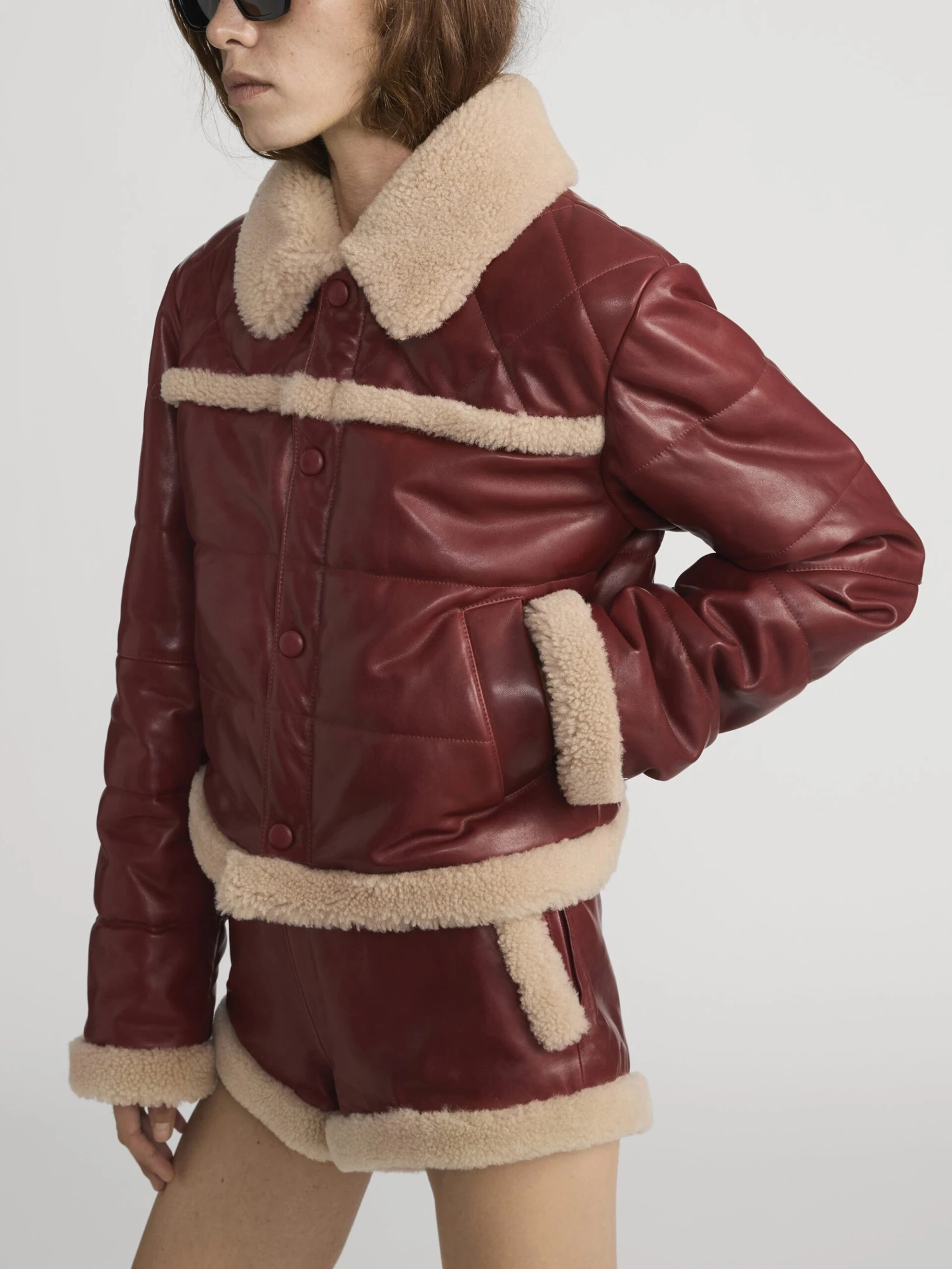 Cut from 100% shearling, this bomber jacket combines warmth with a rugged edge. In a rich dark burgundy colorway that complements any ensemble.