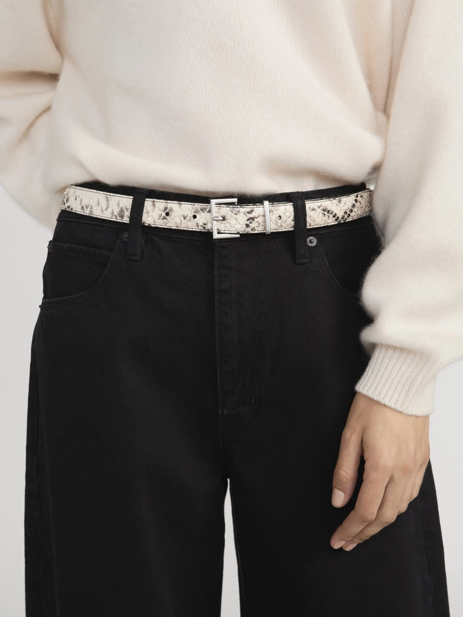 The Snake Square Buckle Belt is crafted from 100% cow leather and updated in a refined snakeskin pattern.
