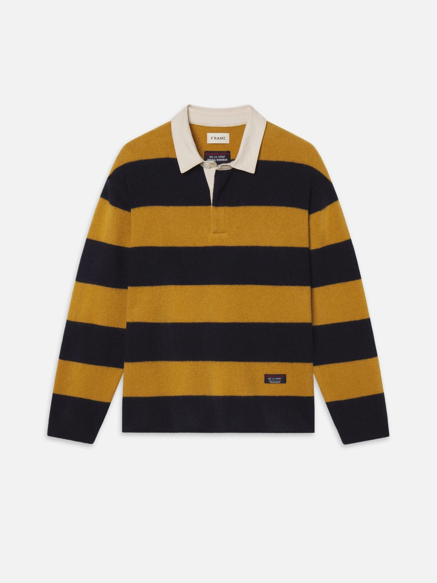 Visual Details: This sweater features bold horizontal stripes in Navy and Dark Yellow, sharply contrasted by a crisp white twill collar. The chest is detailed with an intricate ‘The Society Archive’ crest patch, offering a sophisticated varsity-inspired look that bridges the gap between casual and refined.