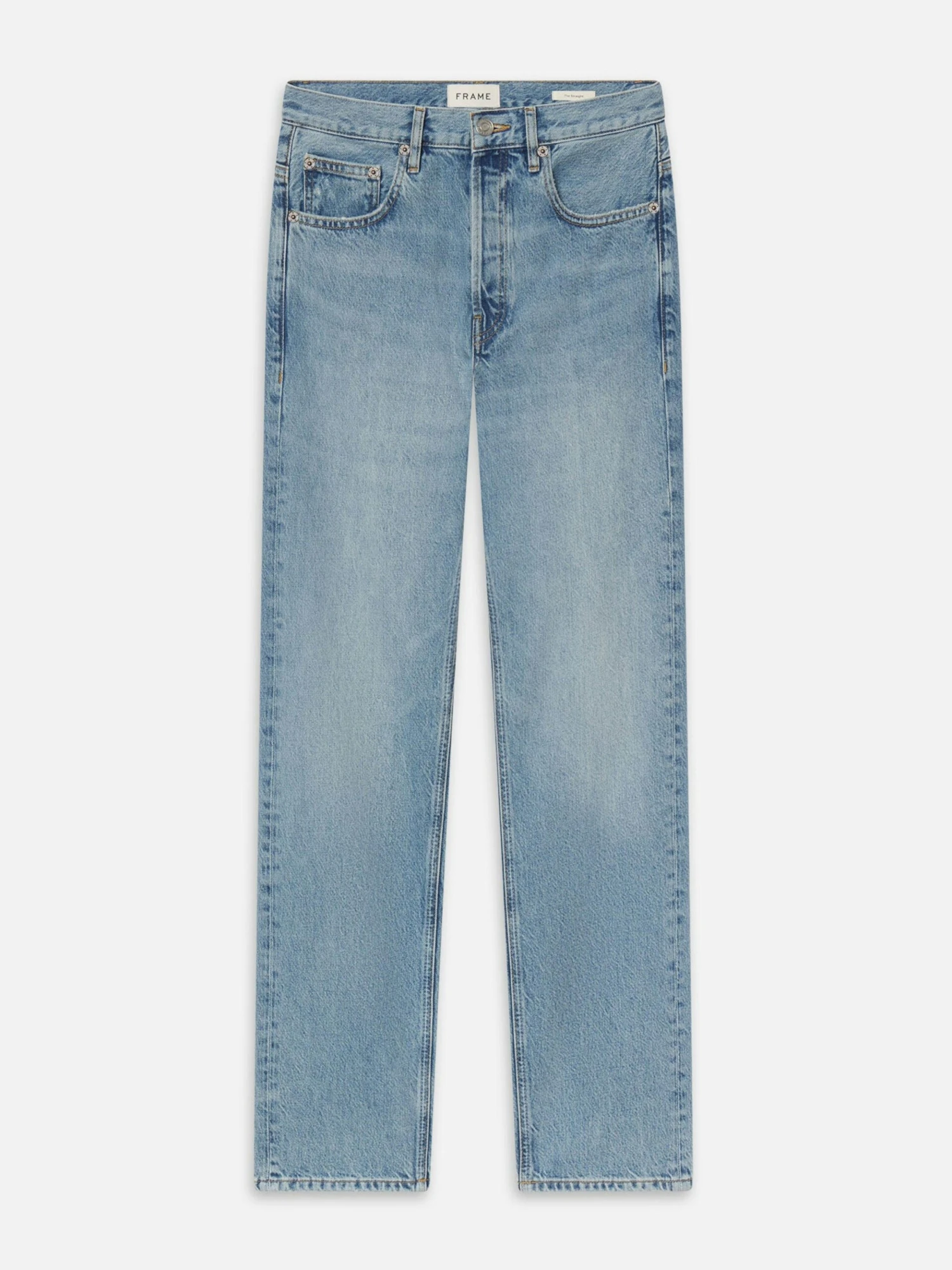 A FRAME favorite with a modern ethos. Designed with a mid-rise fit and clean, straight-leg silhouette, this summary-fly jean is crafted from premium 100% cotton for a classic rigid feel that wears in over time. Finished in a light blue wash for an understated, worn-in look.