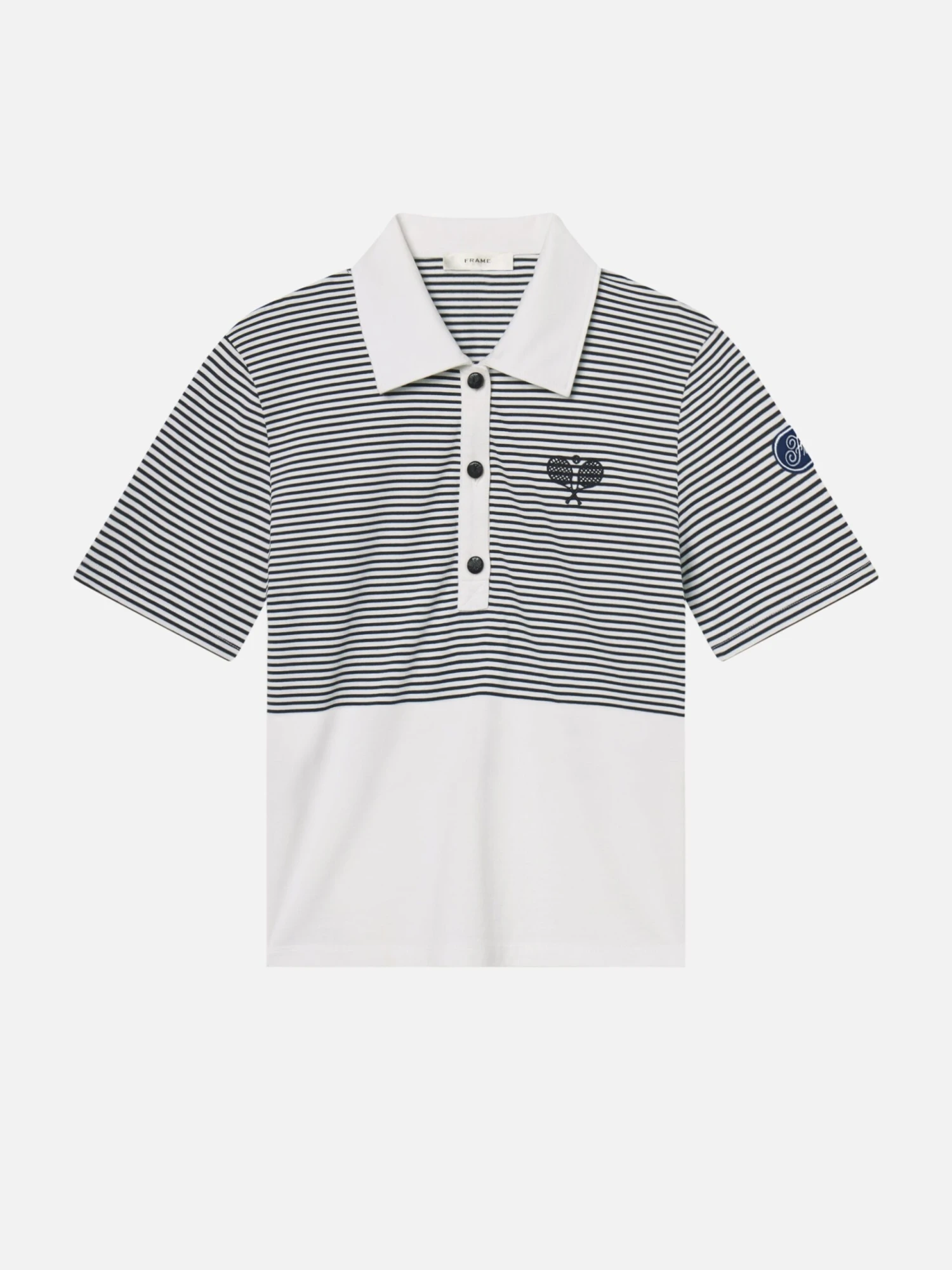 A crisp cotton polo with retro navy and white striping across the chest. Finished with a contrast collar, navy summarys with custom FRAME tennis racket details, and tennis racket embroidery at the chest—a subtle nod to vintage sport.