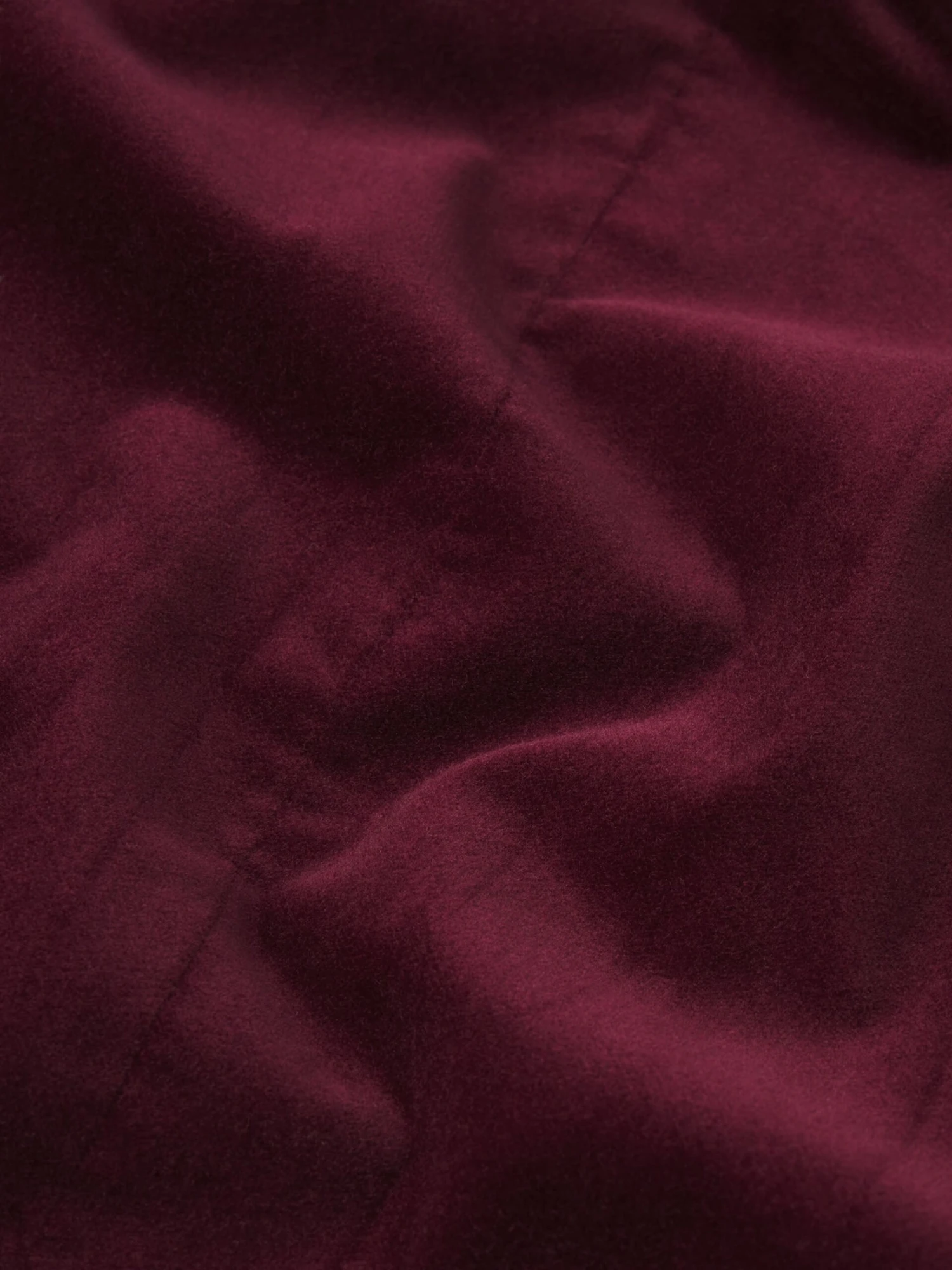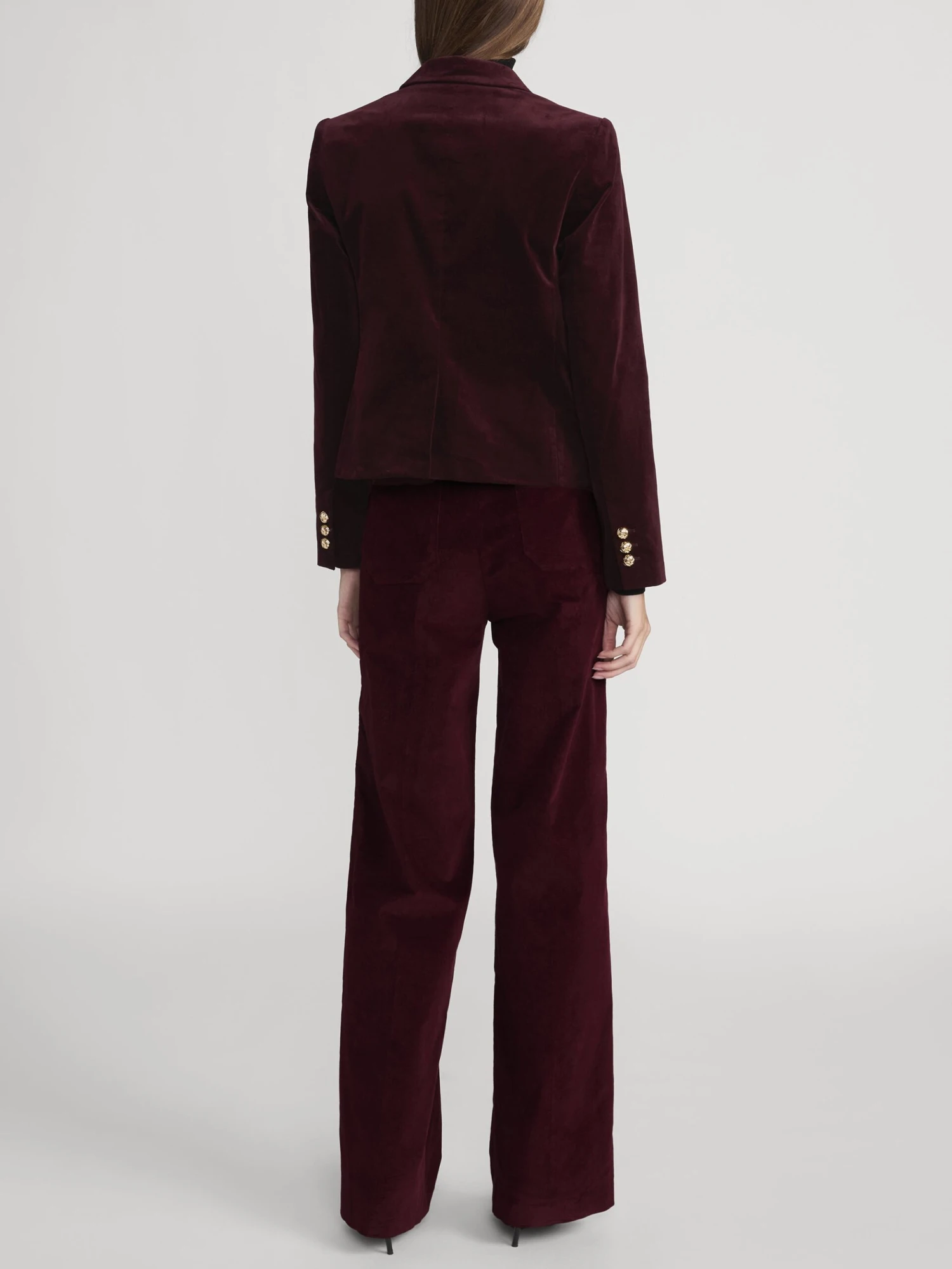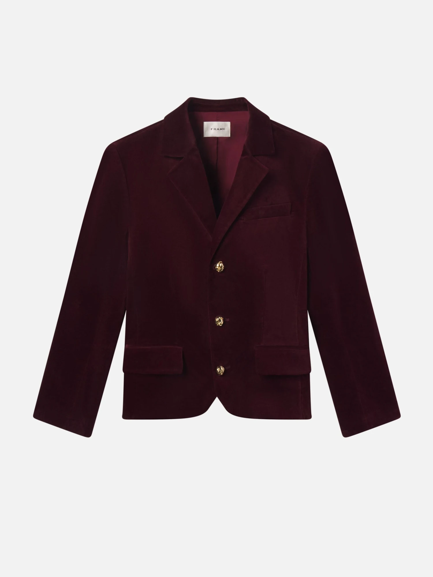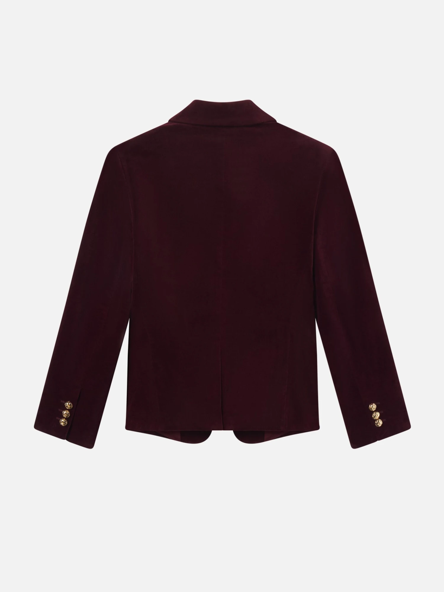 Our bestselling Smart Blazer, now in rich cabernet velvet—with a touch of stretch for the perfect fit. Features signature gold knotted summarys, notched lapels, double front flap pockets and a chest pocket. Pair with the Modernist Pocket Trouser for the ultimate seasonal uniform.